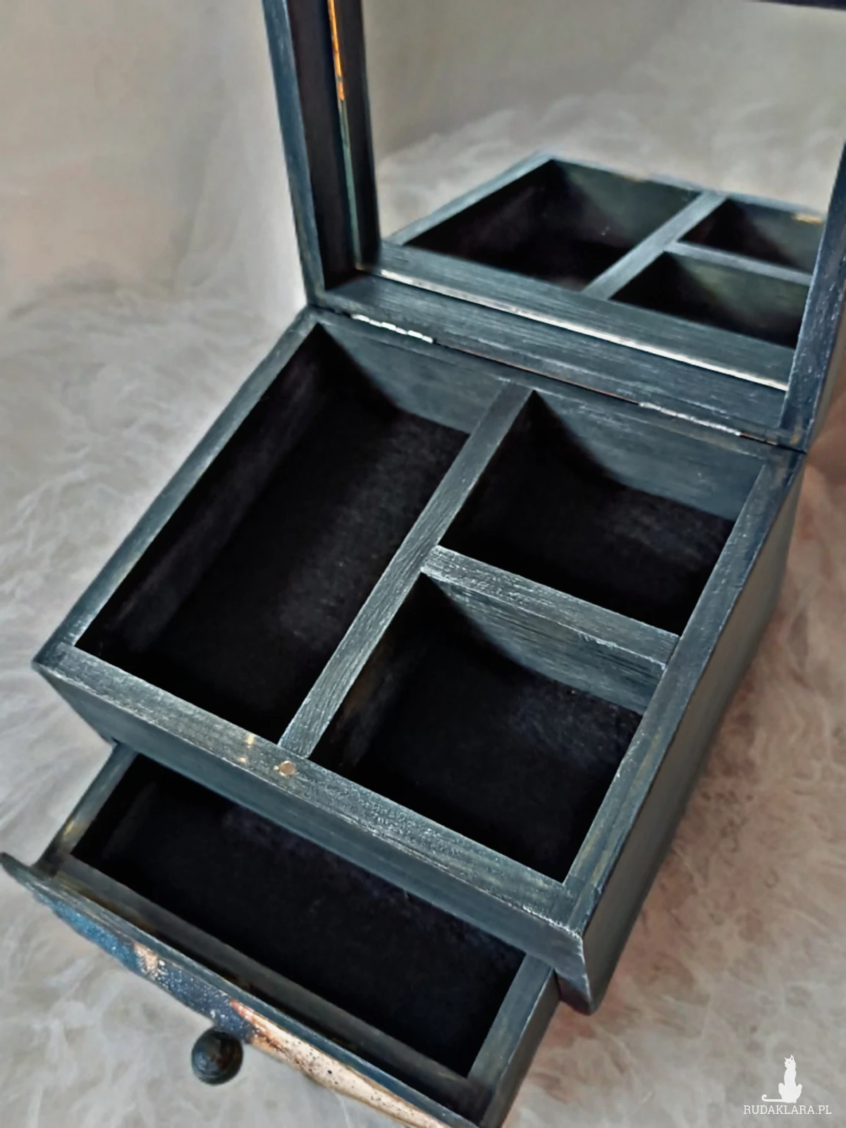 Drewniana skrzyneczka na biżuterię, z przegródkami, dodatkową szufladką i lusterkiem.