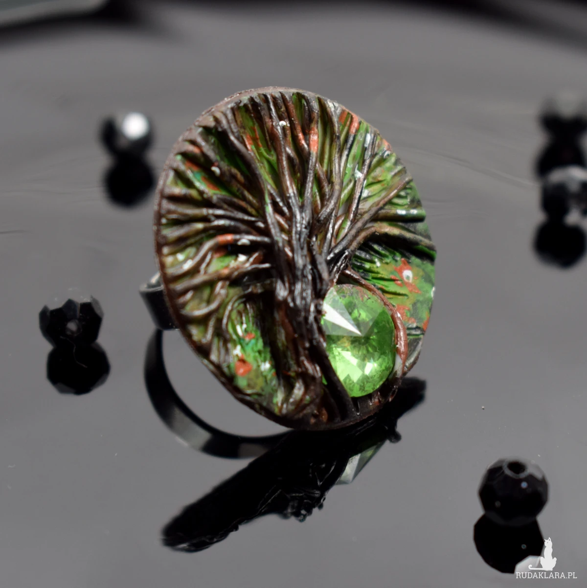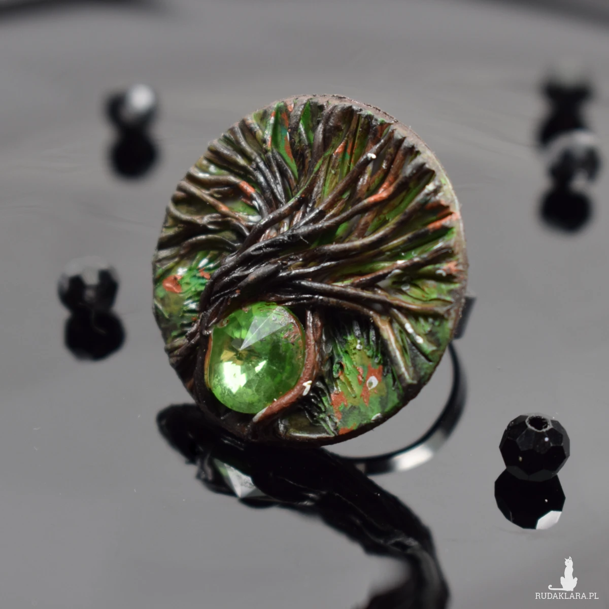 Duży, przyciągający uwagę pierścionek z motywem drzewa, oplatającego pięknie mieniący się, zielony kryształ.
