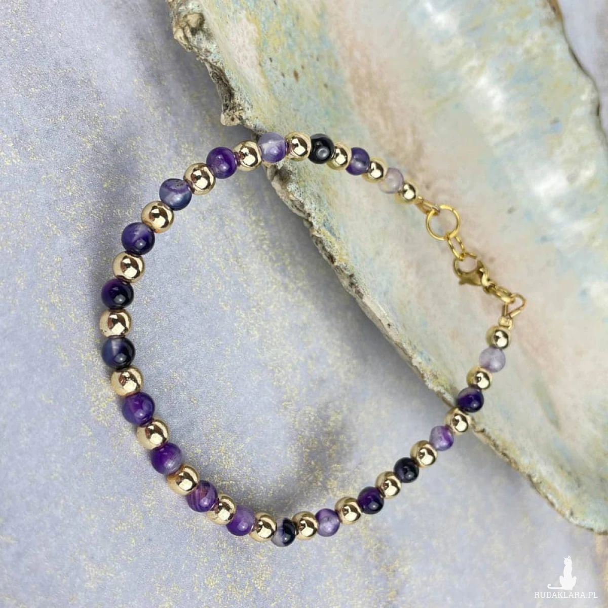 Minimalistyczna bransoletka wykonana z naturalnych agatów w odcieniach fioletu, które subtelnie podkreślają nadgarstek. Drobne kamienie zostały uzupełnione złocistymi akcentami – hematytem oraz pozłacanymi elementami ze stali chirurgicznej, które dodają całości elegancji i delikatnego blasku. Połączenie chłodnych tonów agatu z ciepłym złotem tworzy harmonijną i pełną klasy kompozycję. To biżuteria dla kobiet, które lubią łączyć prostotę z elegancją i cenią detale wykonane z najwyższą starannością.