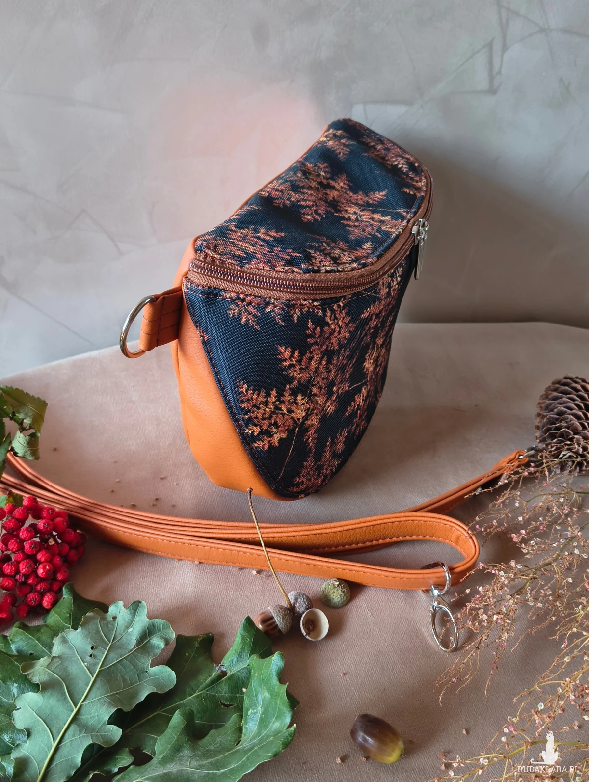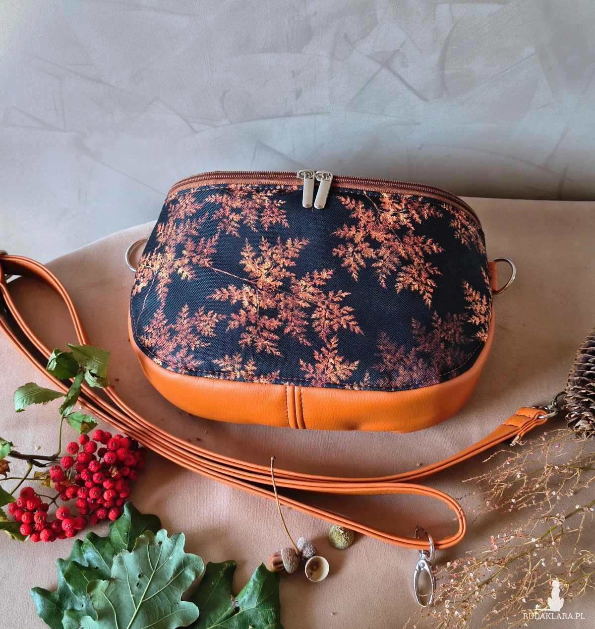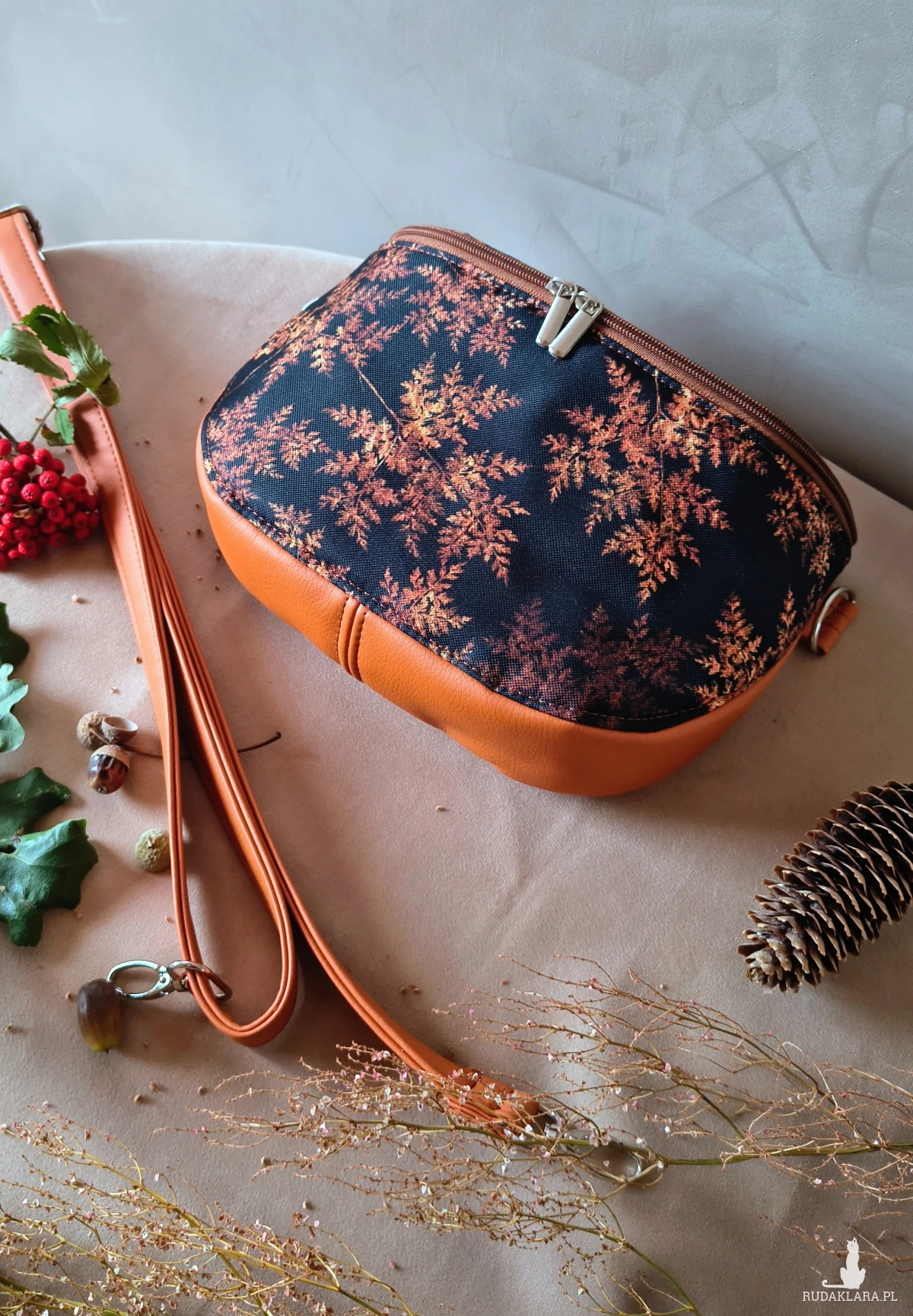 Torebka wykonana z ekoskóry w kolorze rudym oraz poliestru wodoodpornego w liście. Wewnątrz znajduje się wodoodporna, brązowa podszewka z kieszonką na zamek. Pasek wykonany z ekoskóry, regulowany. Okucia w kolorze srebrnym.
