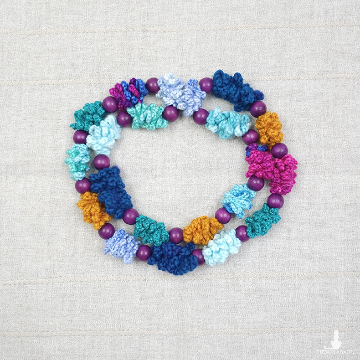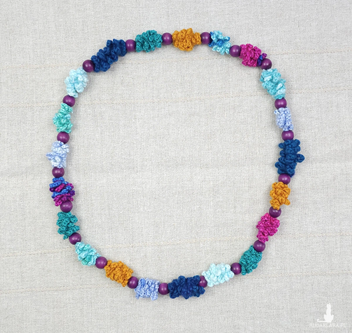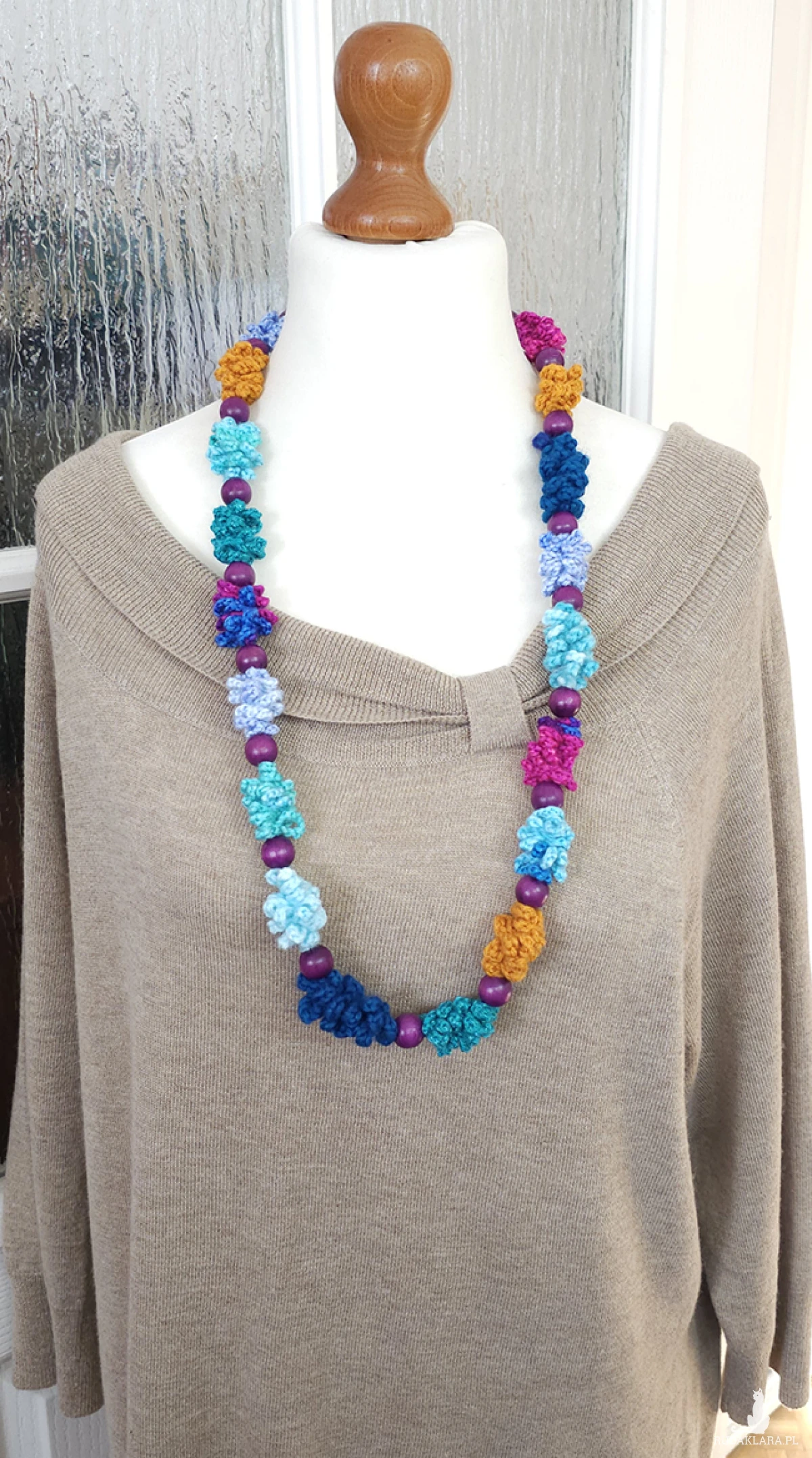 Wykonany z miękkiej włóczki akrylowej, z pięknie kontrastującymi drewnianymi koralikami.