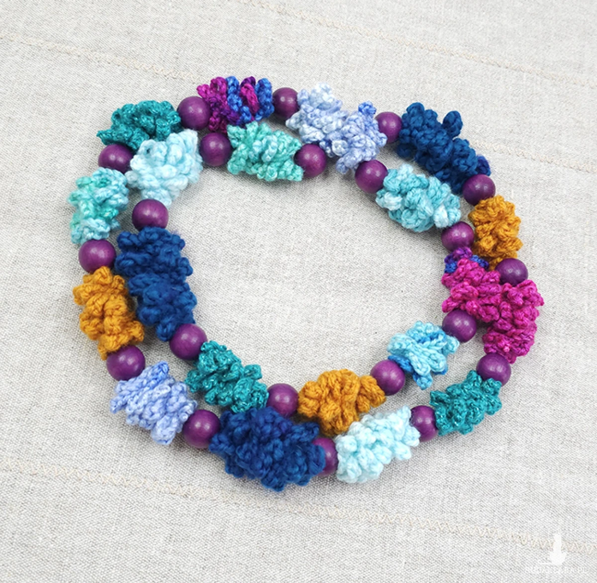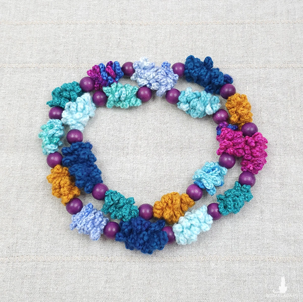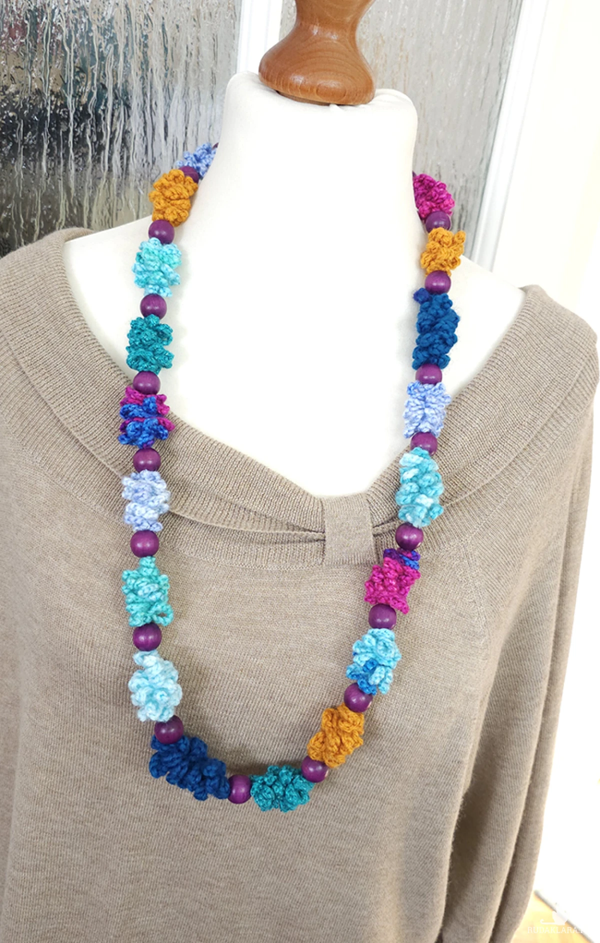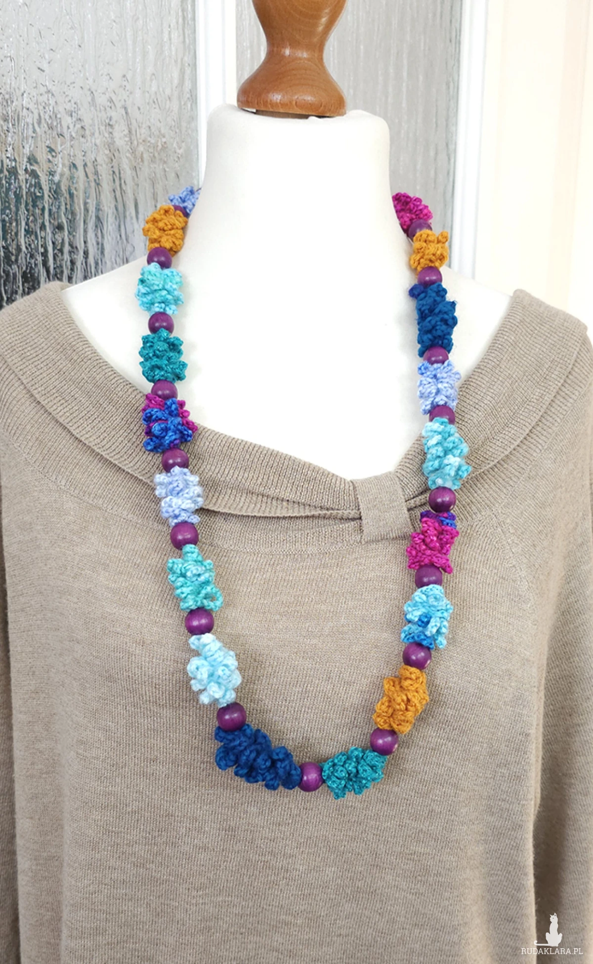 Wykonany z miękkiej włóczki akrylowej, z pięknie kontrastującymi drewnianymi koralikami.