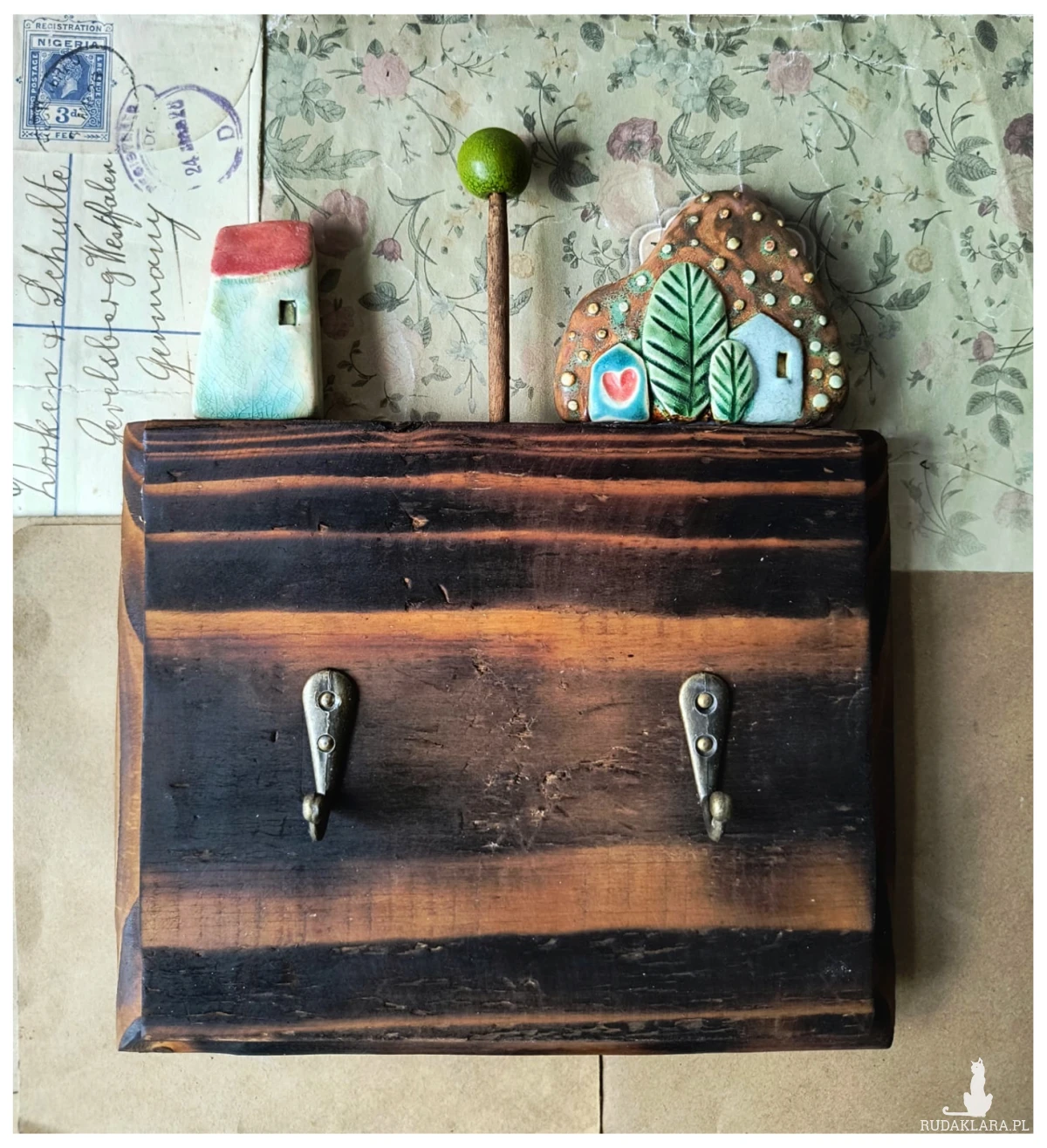 Drewniany wieszak o wymiarach 18 cx 22 cm z ceramicznymi dodatkami w sielskim stylu, wykonanymi z gliny ceramicznej wypalonymi na biskwit w temp. ok 1260 stopni C. Polecam serdecznie.