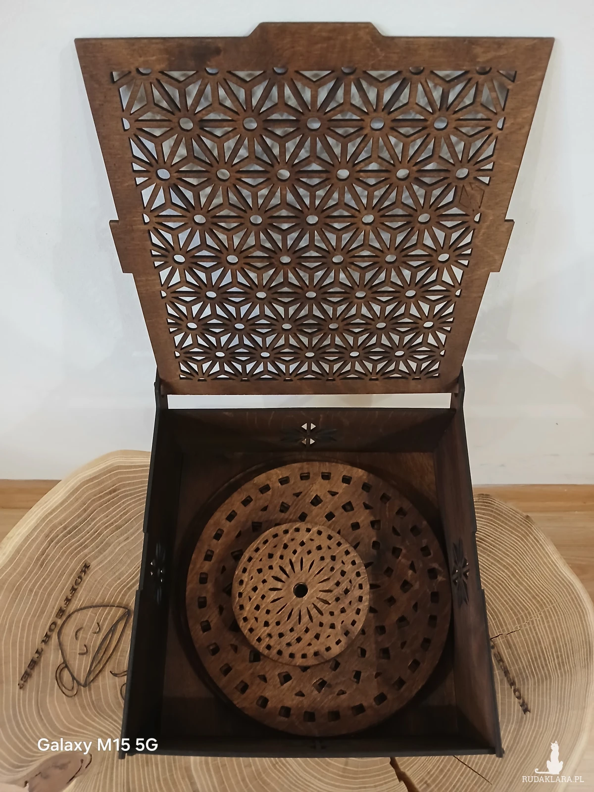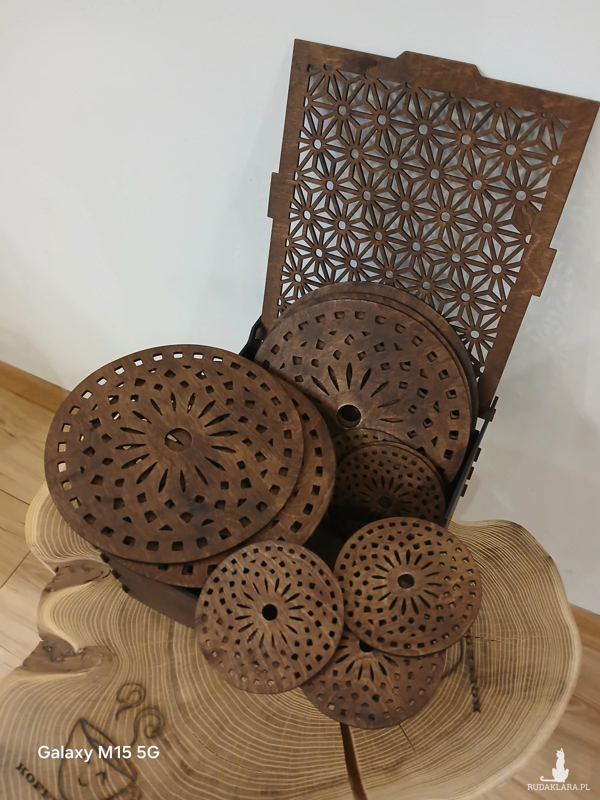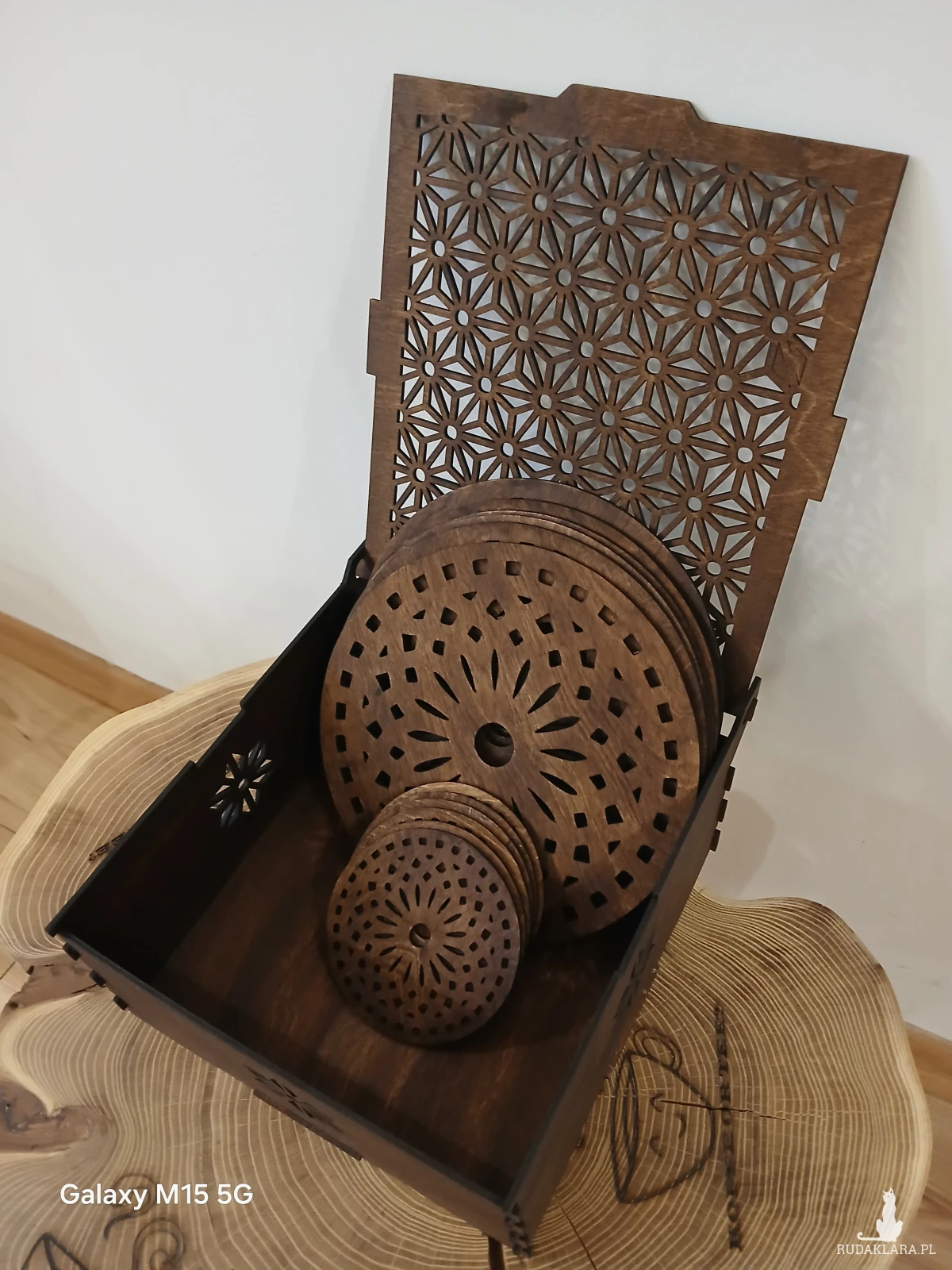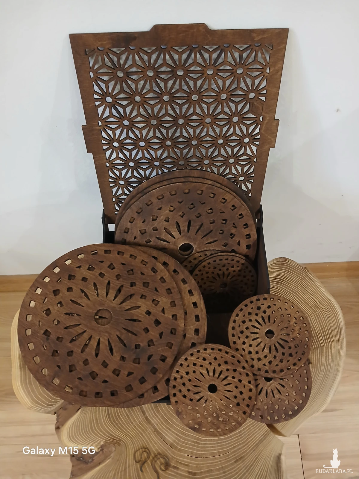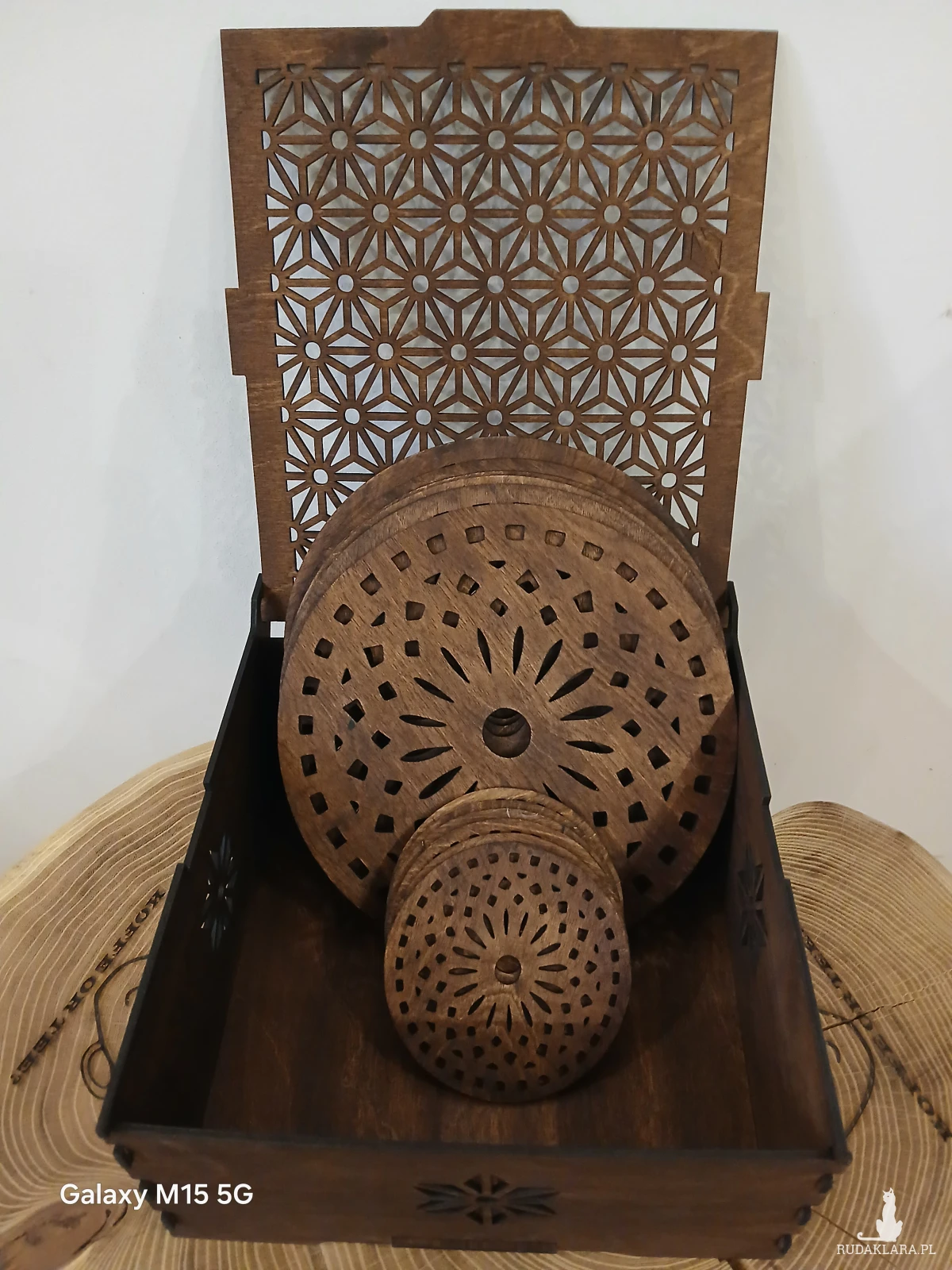 Podkładki pod talerze i kubki wycinane laserowo ze sklejki 3mm wraz ze skrzynką na te podkładki. Podkładki pod kubki 10cm,podkładki pod talerze 20cm Skrzynka wym:wys.10,5cm szer.25cm.Komplet zawiera sześć podkładek pod talerze i sześć podkładek pod kubki. Całość zabezpieczona bejcą w kolorze palisander, ale może być inny kolor jeśli go posiadam.