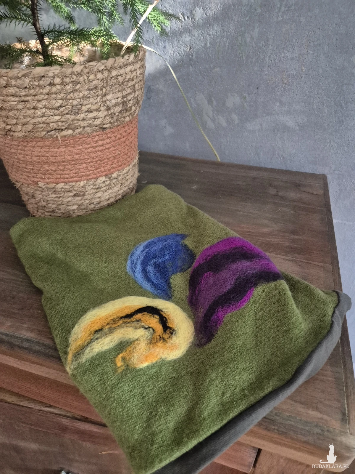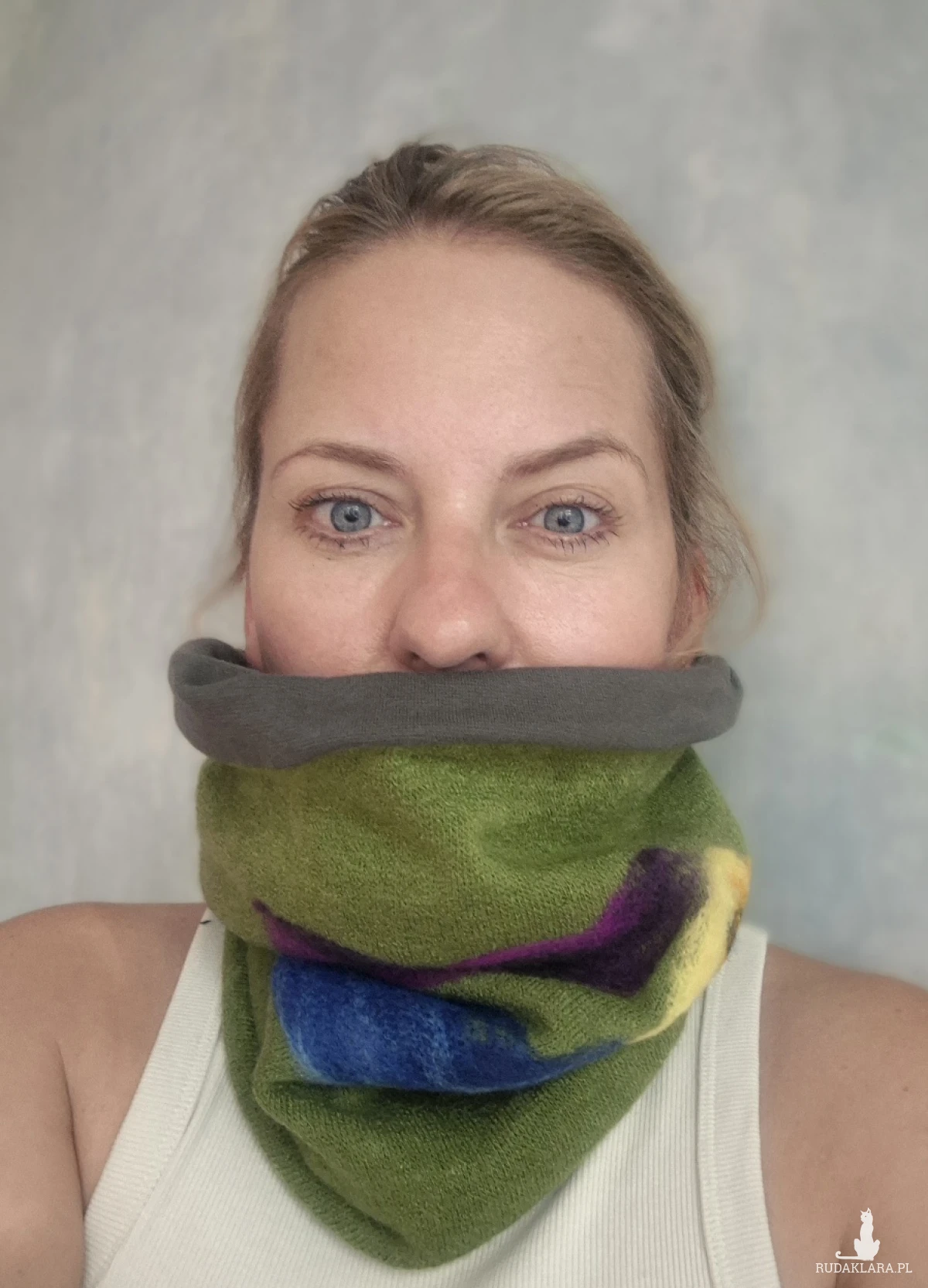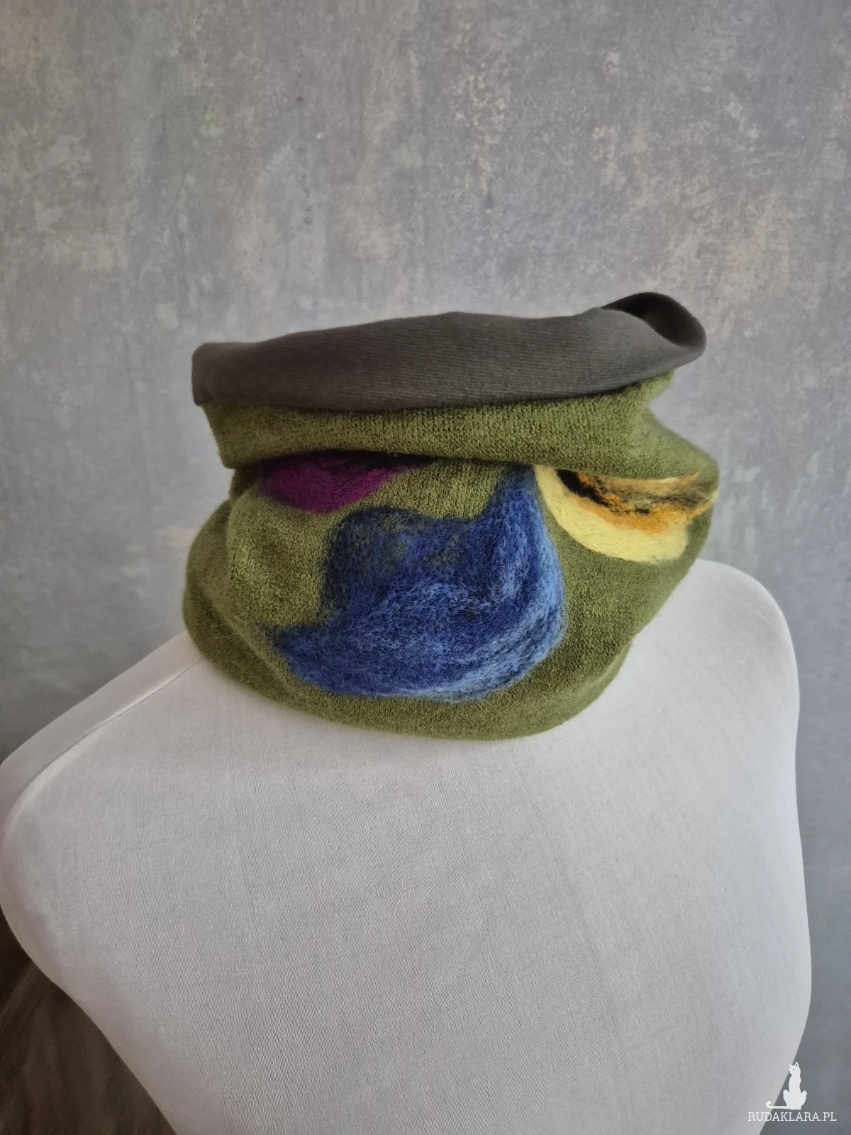Komin wełniany filcowany wełną merynosów rozmiar 39 na 32 cm na podszewce blisko szyi można go również naciągnąć na głowę niezwykle miły i ciepły polecam  box d1