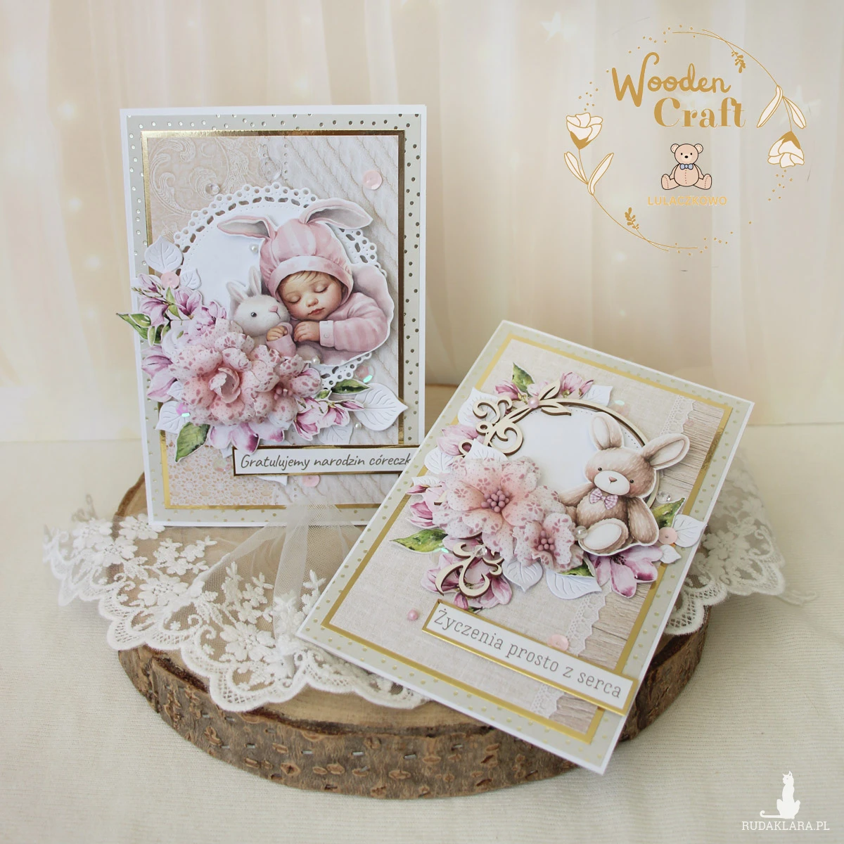 Przepiękna i delikatna kartka gratulacyjna z okazji narodzin maluszka, utrzymana w odcieniach oliwkowej zieleni, beżu i różu z dodatkiem złotych błyszczących akcentów. Kartka wykonana ręcznie z dbałością o każdy szczegół, z mixu kolekcji papierów. Na froncie znajduje się grafika uroczej śpiącej dziewczynki z króliczkiem, ozdobiona kompozycją kwiatową z materiałowych kwiatuszków, dodatkowo zdobiona cekinami, a także napisem "Gratulujemy narodzin córeczki" (na życzenie mogę wkleić na kartce również imię dziecka).