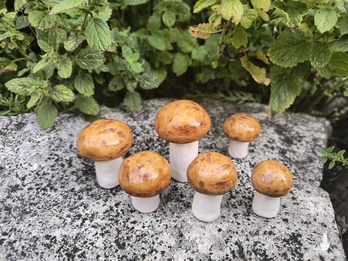 Komplet 6 maślaków wykonanych z gliny szamotowej, wypalonych na biskwit, a następnie szkliwionych w temperaturze 1260 stopni C. Wysokość od 4 do 6 cm. Idealne do ogrodu lub dużej donicy z iglakami. Serdecznie polecam!!!