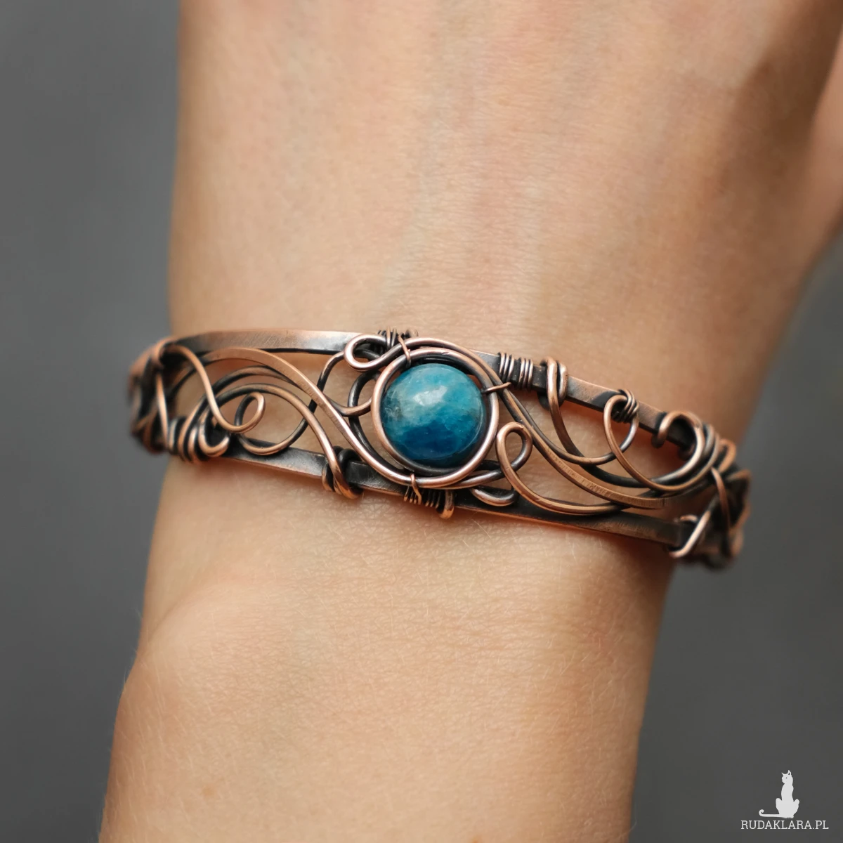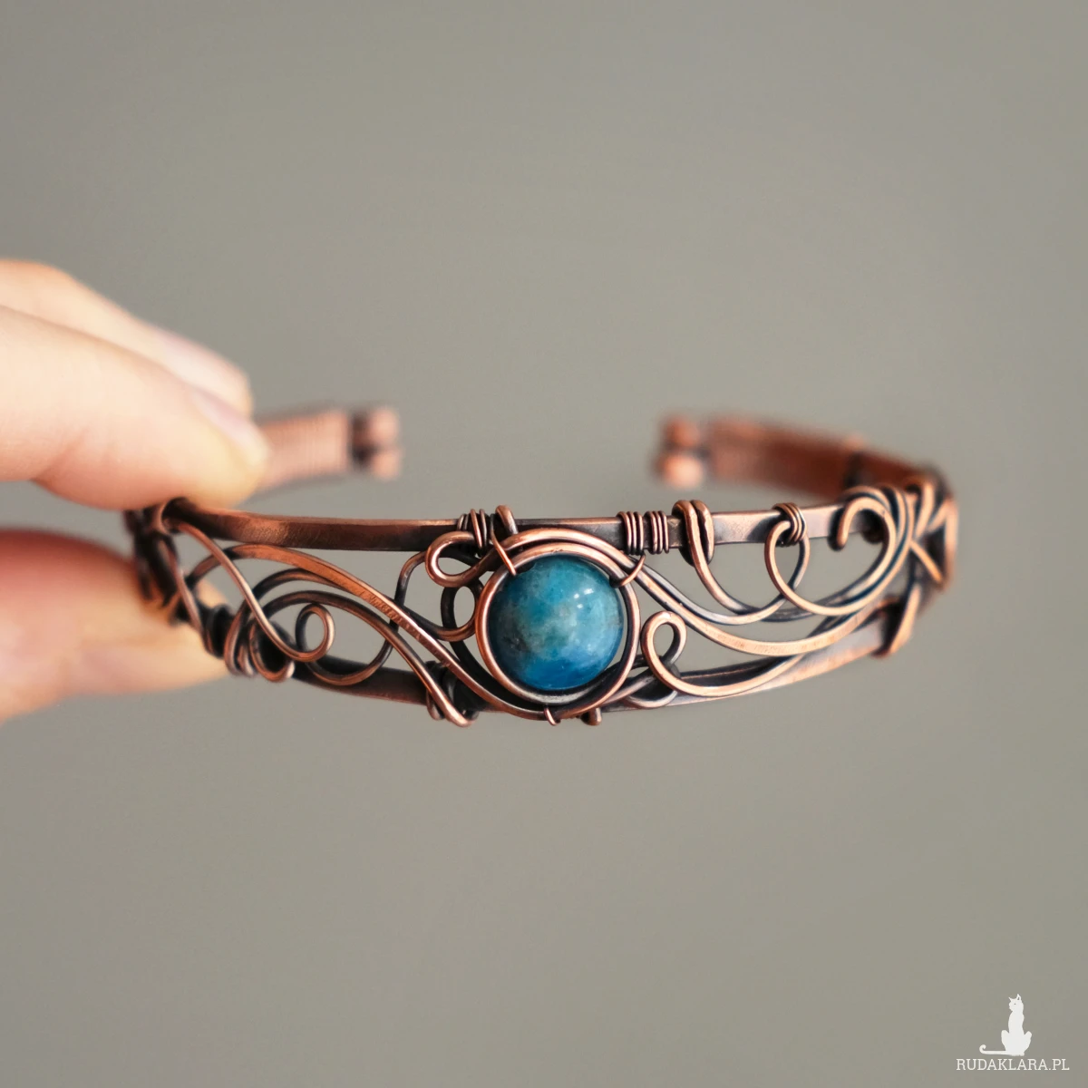 Miedziana bransoletka w elfickim stylu mieści w sobie kamień apatytu. Oplatają ją sploty miedzianego drutu nadające baśniowego klimatu.