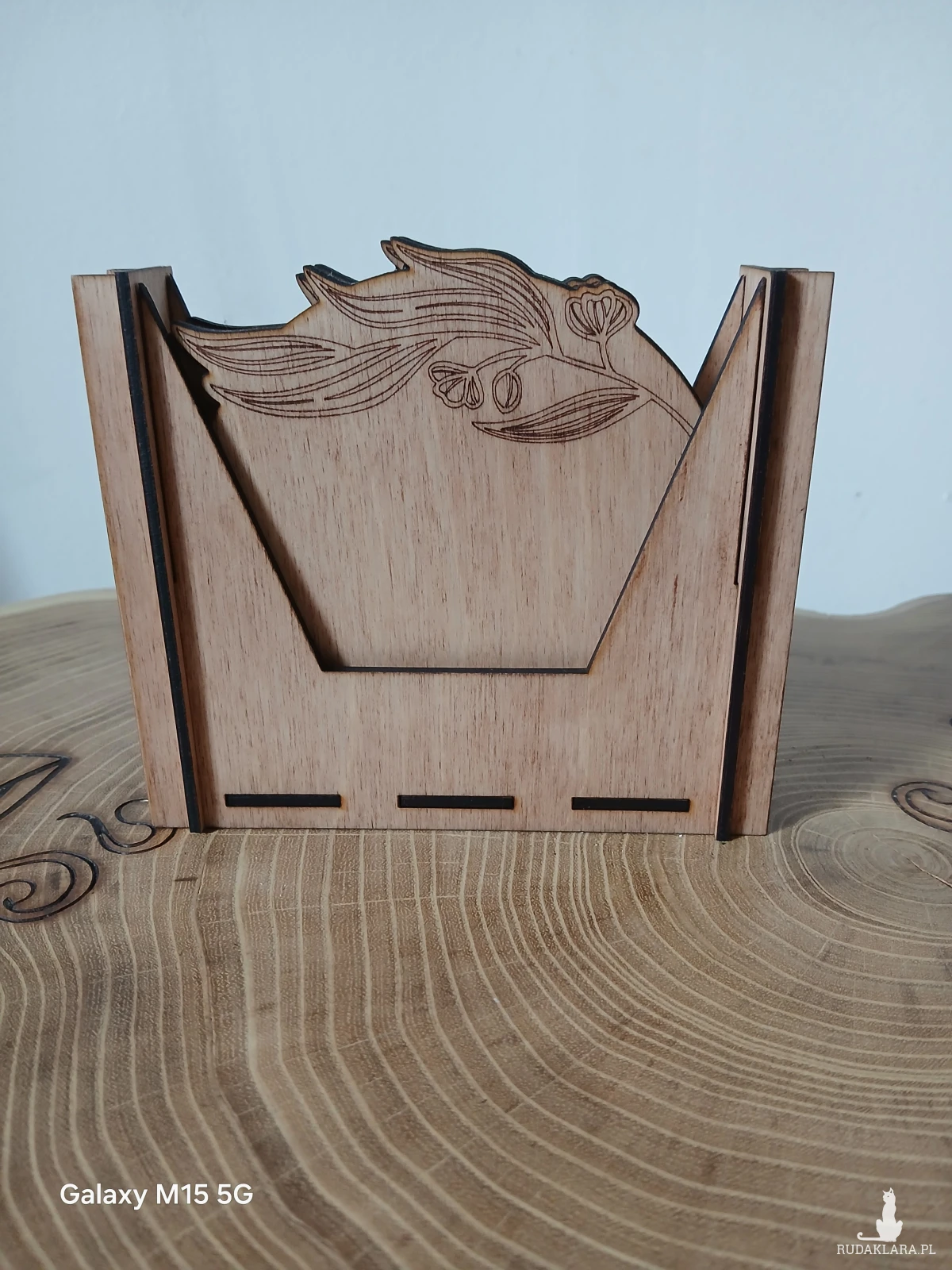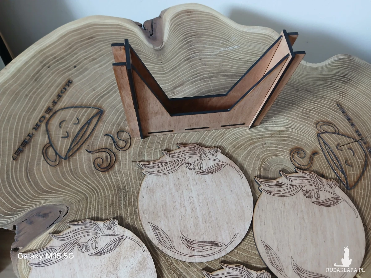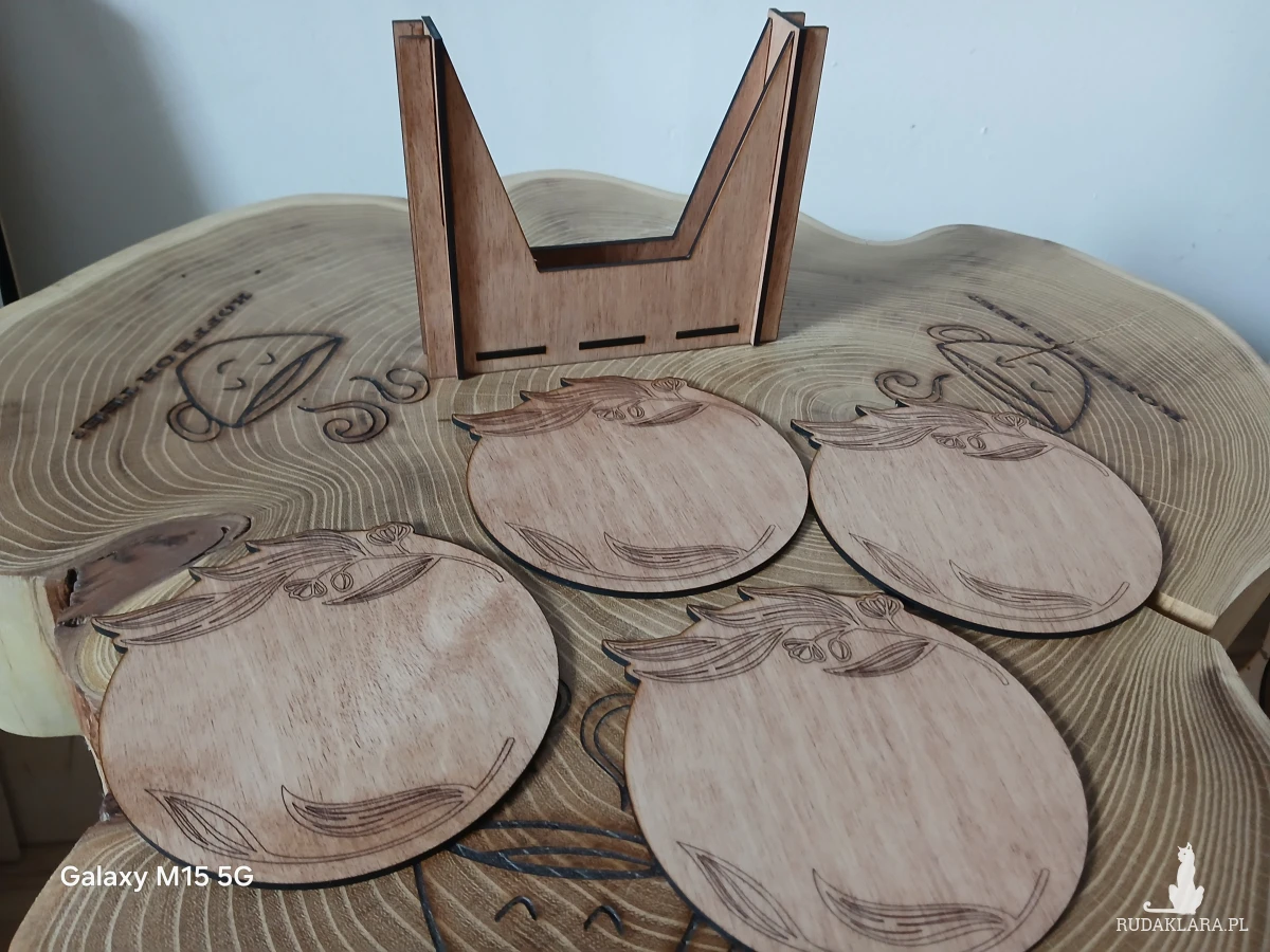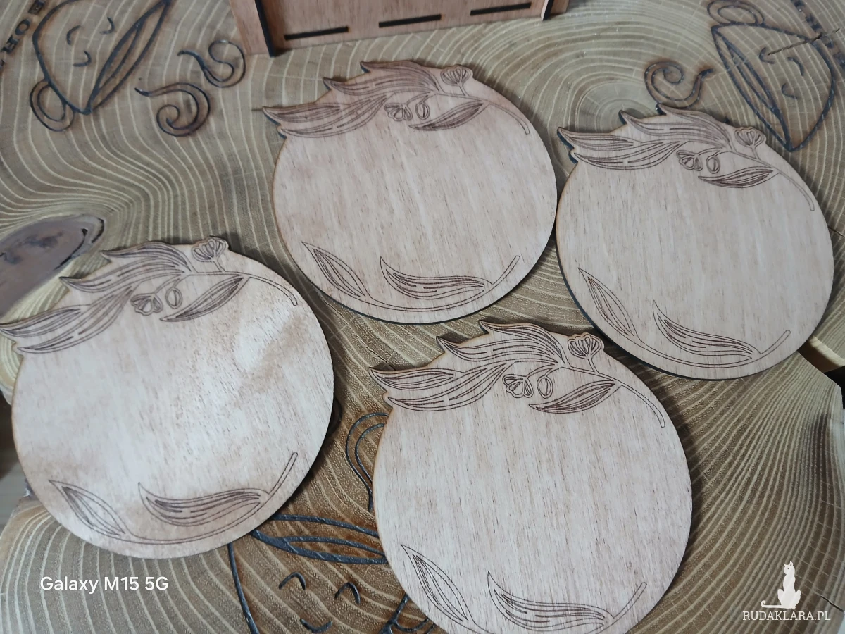 Podkładki pod kubki z delikatnym grawerem ,ze sklejki 3mm,woskowane, średnica 10 cm ,komplet 4 sztuk plus kasetka.