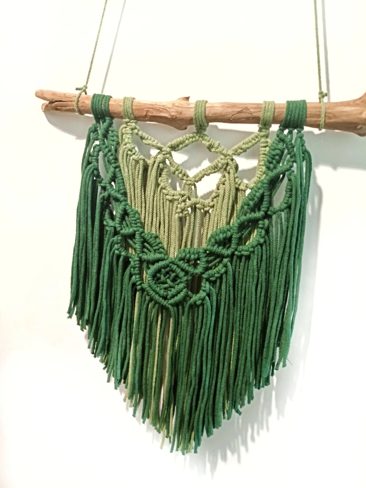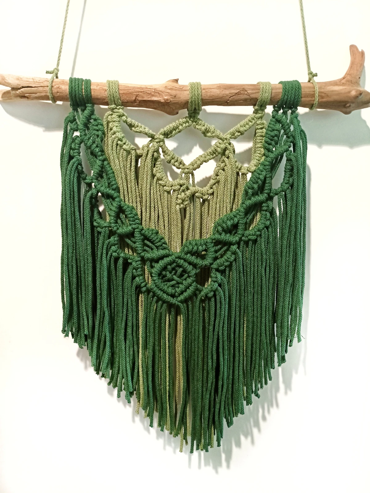 makrama na ścianę • mała makrama handmade • dekoracja boho do salonu • makrama szałwiowa • ozdoba z bawełnianego sznurka • makrama na gałęzi • dekoracja rustykalna • makrama zielona • polskie rękodzieło • prezent boho handmade