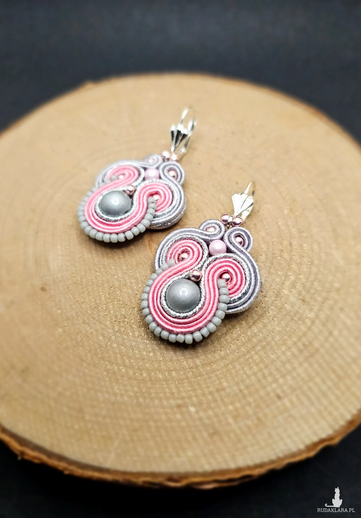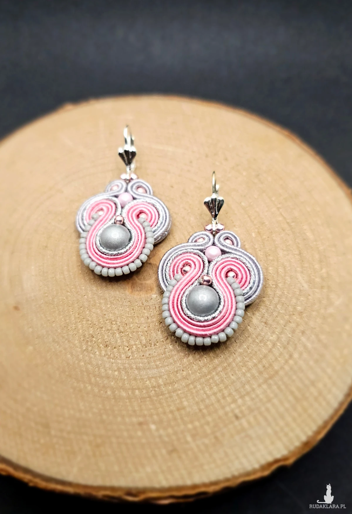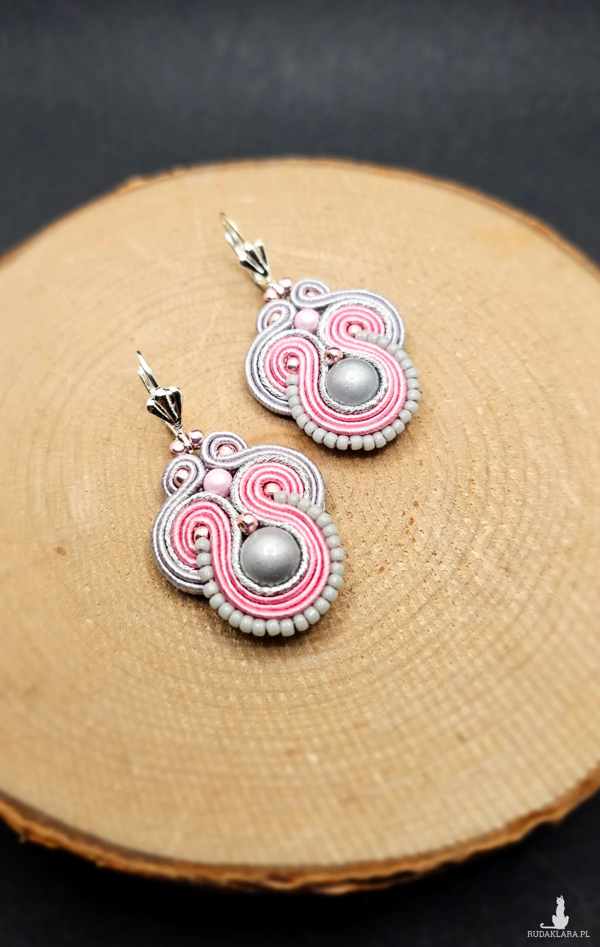 Kolczyki w kolorze różowo-szarym z szklanymi kulkami. Srebrne kulki otoczone sznurkami sutasz oraz szklanymi koralikami w kolorze szarym i różowym o różnych wielkościach. Srebrny metalizowany sznurek dodaje kolczykom elegancji i wyrazistości. Kolczyki zawieszone na ozdobnych biglach angielskich w kolorze srebrnym.