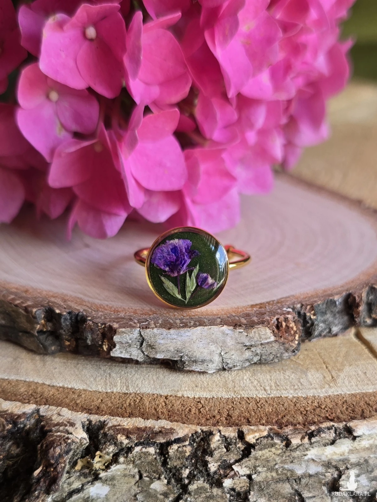Oferuję Państwu unikalną biżuterię. Pierścionek jest wykonany z suszonych kwiatów i żywicy epoksydowej. Biżuteria jest wspaniałym i oryginalnym prezentem na lata.