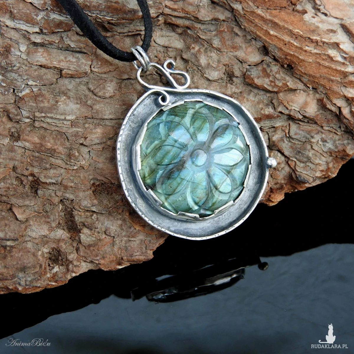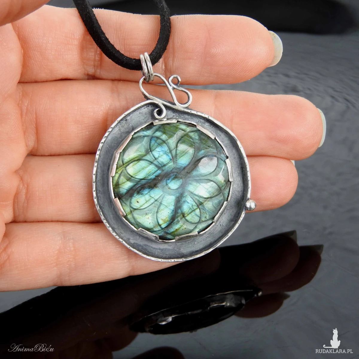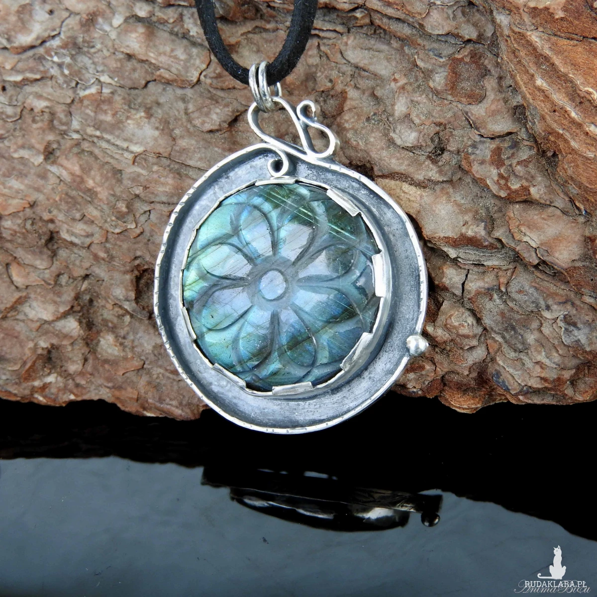 labradoryt rzeźbiony na kształt mandali, iryzujący w kolorze zieleni i błękitu