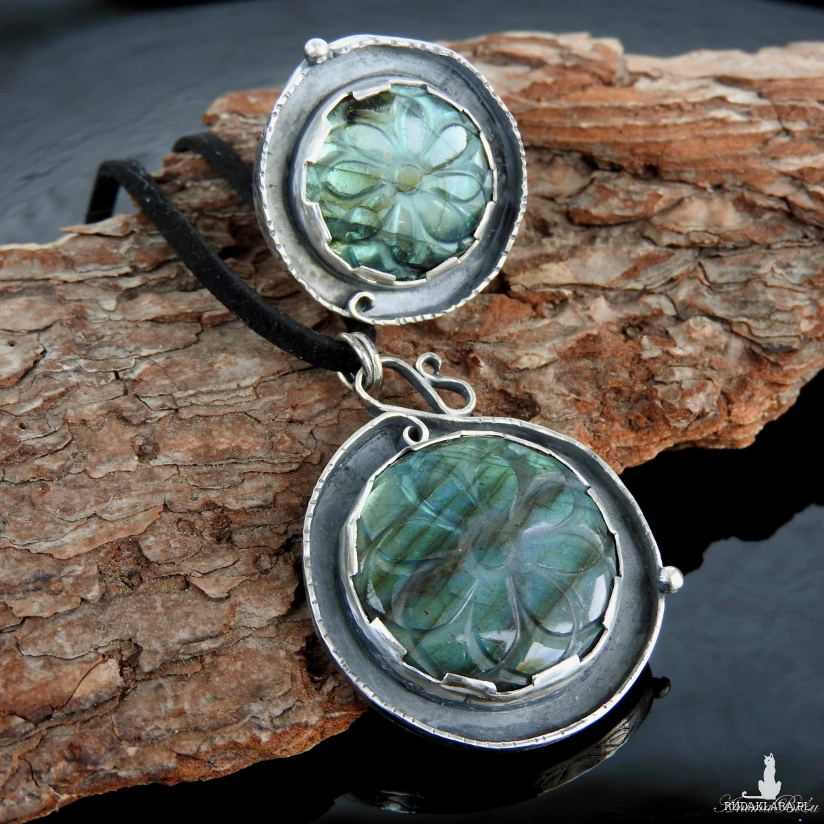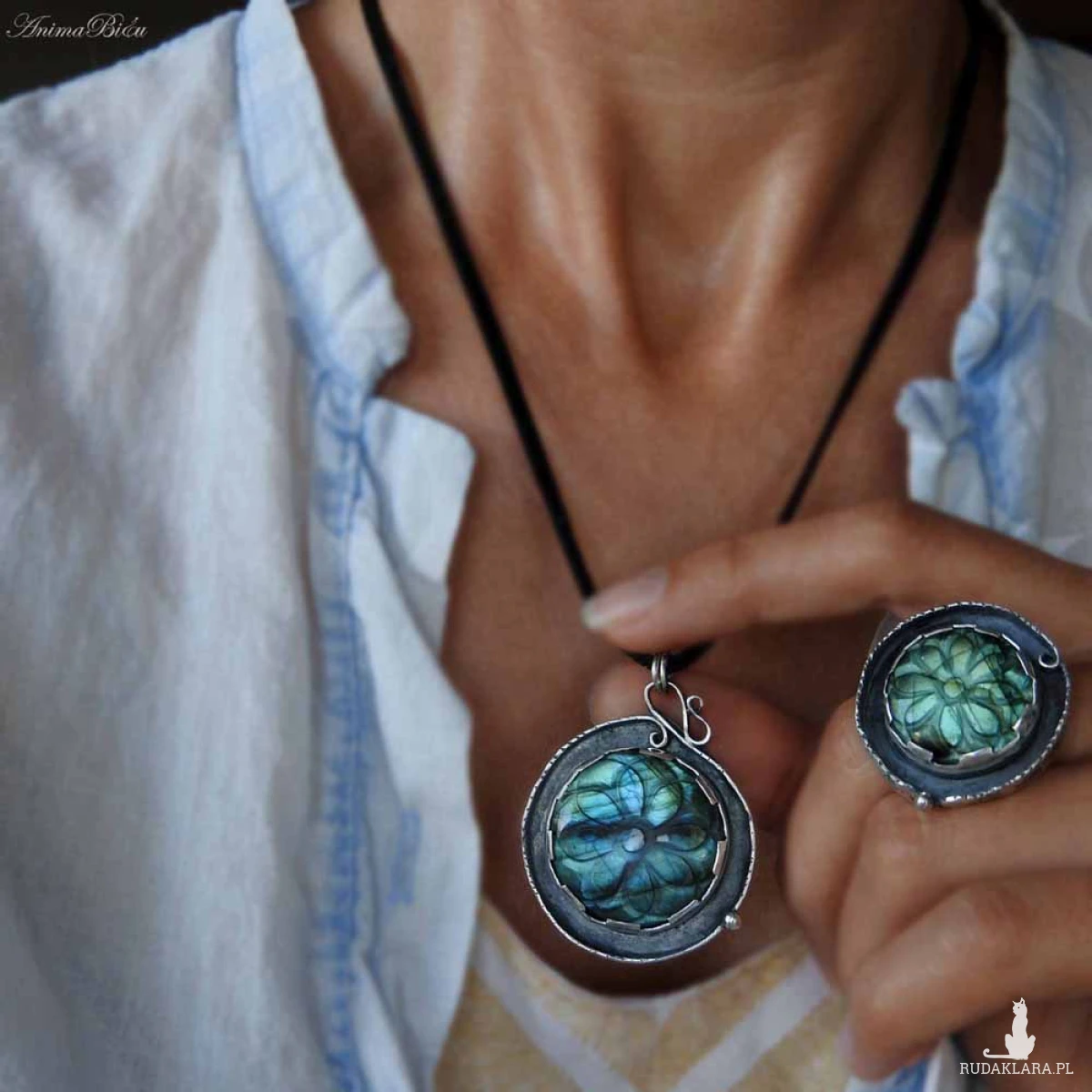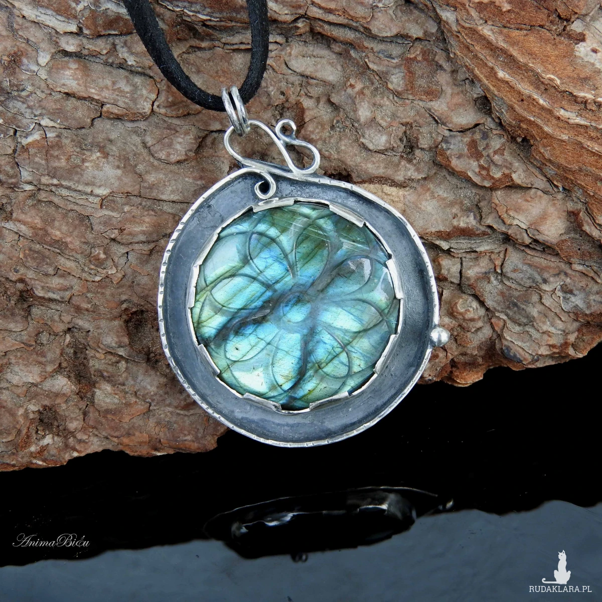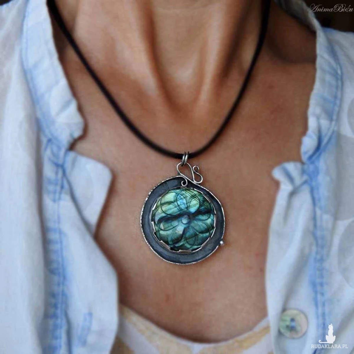labradoryt rzeźbiony na kształt mandali, iryzujący w kolorze zieleni i błękitu