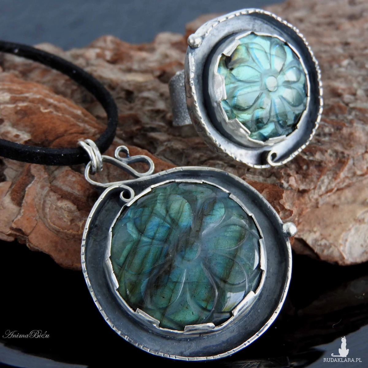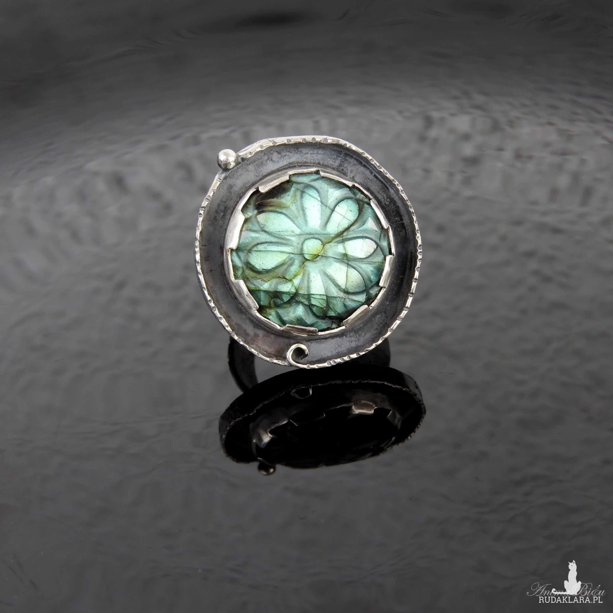 labradoryt rzeźbiony na kształt mandali, iryzujący w kolorze zieleni i błękitu