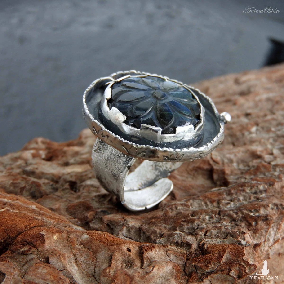 Pierścionek srebrny z labradorytem. Piękny, madagaskarski