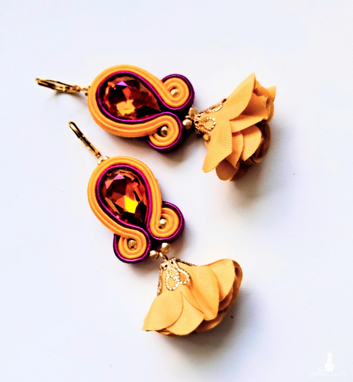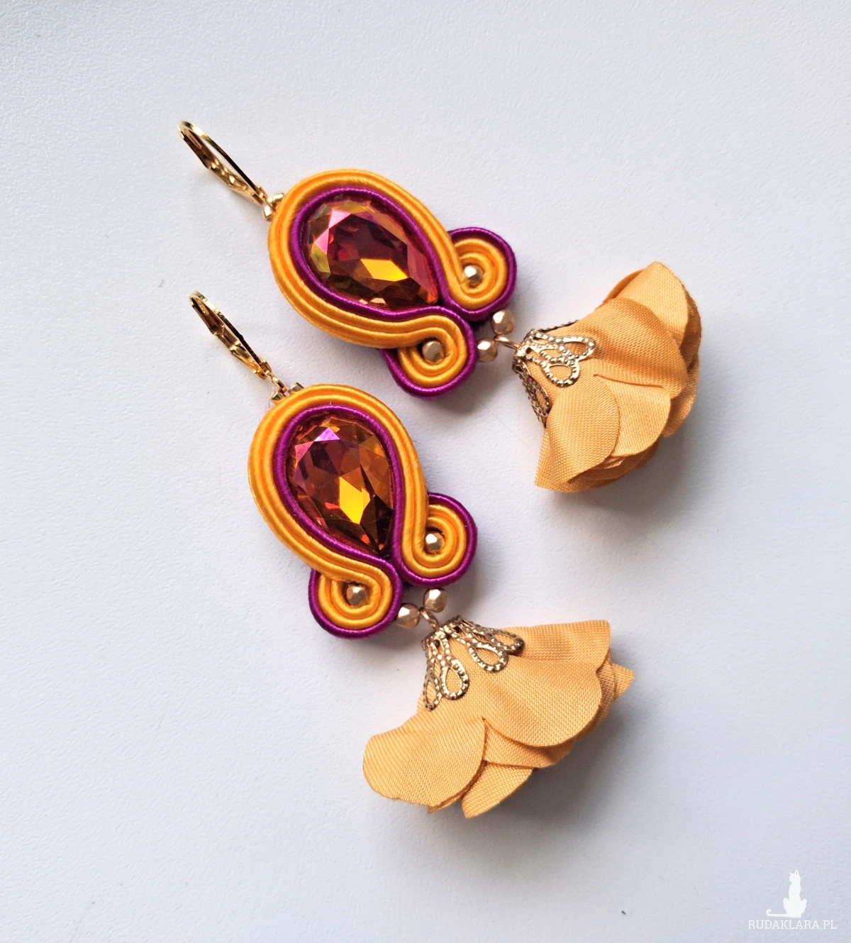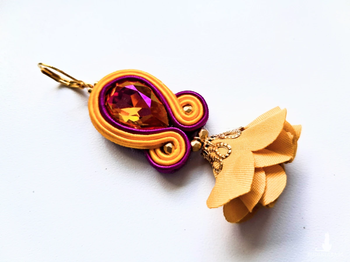 Materiał: sutasz, kwiat satynowy, koraliki Fire Polish, kryształ szlifowany.