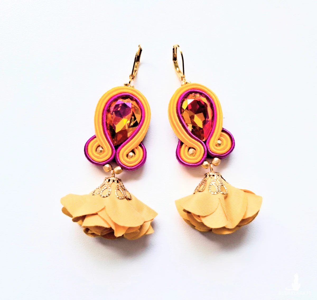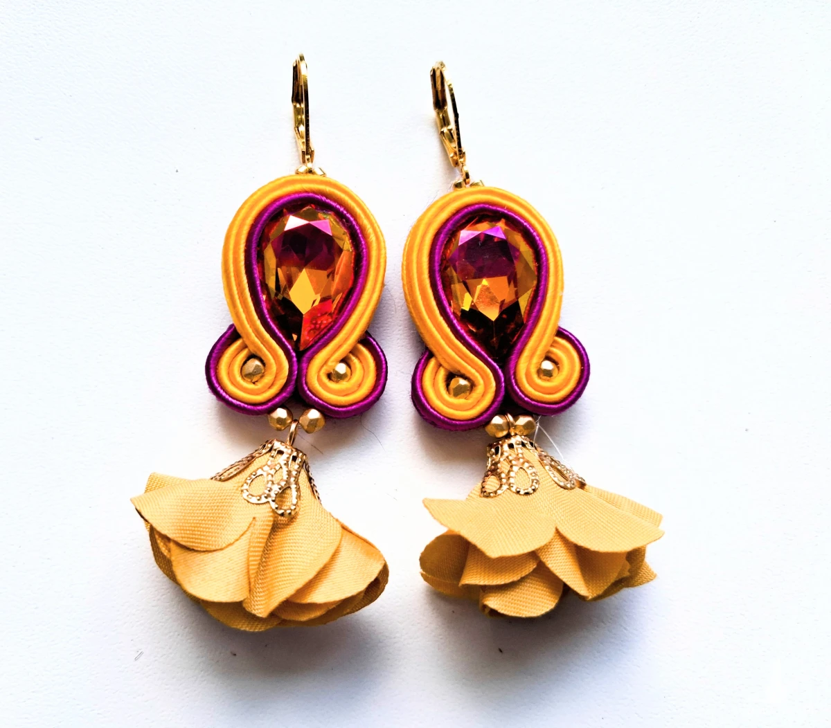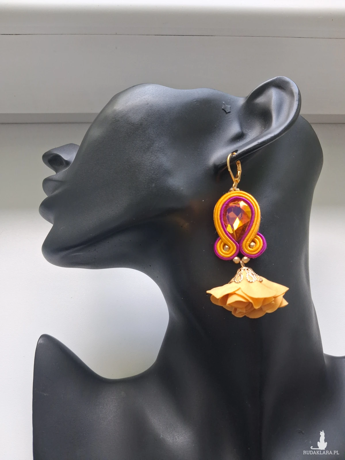 Materiał: sutasz, kwiat satynowy, koraliki Fire Polish, kryształ szlifowany.