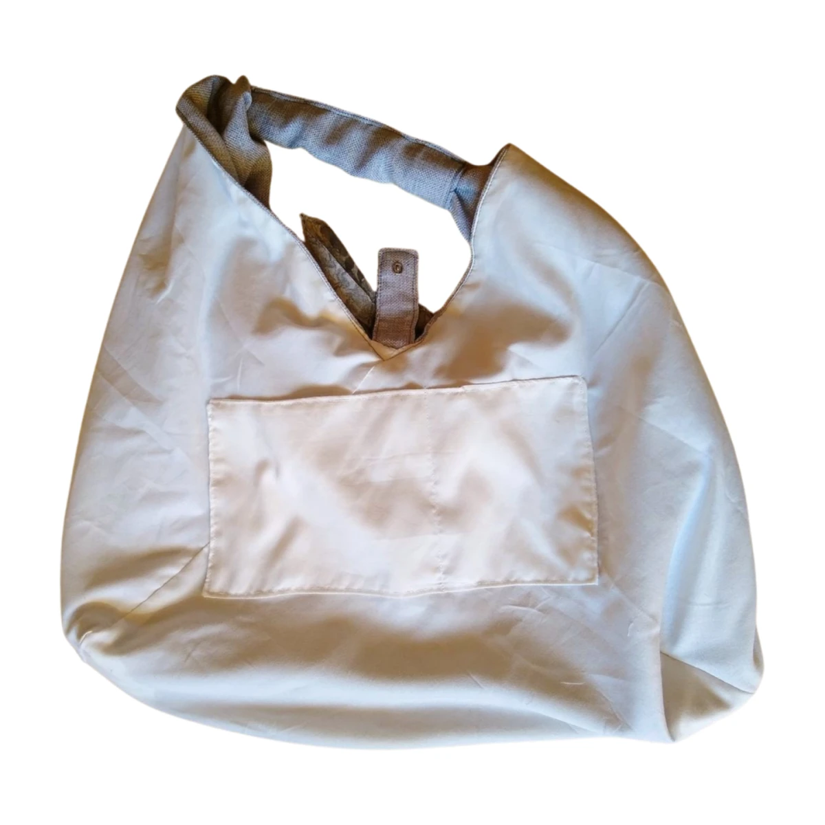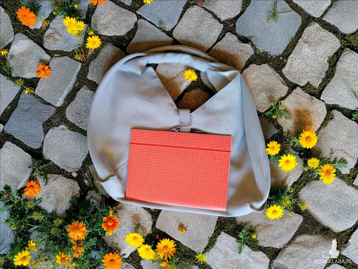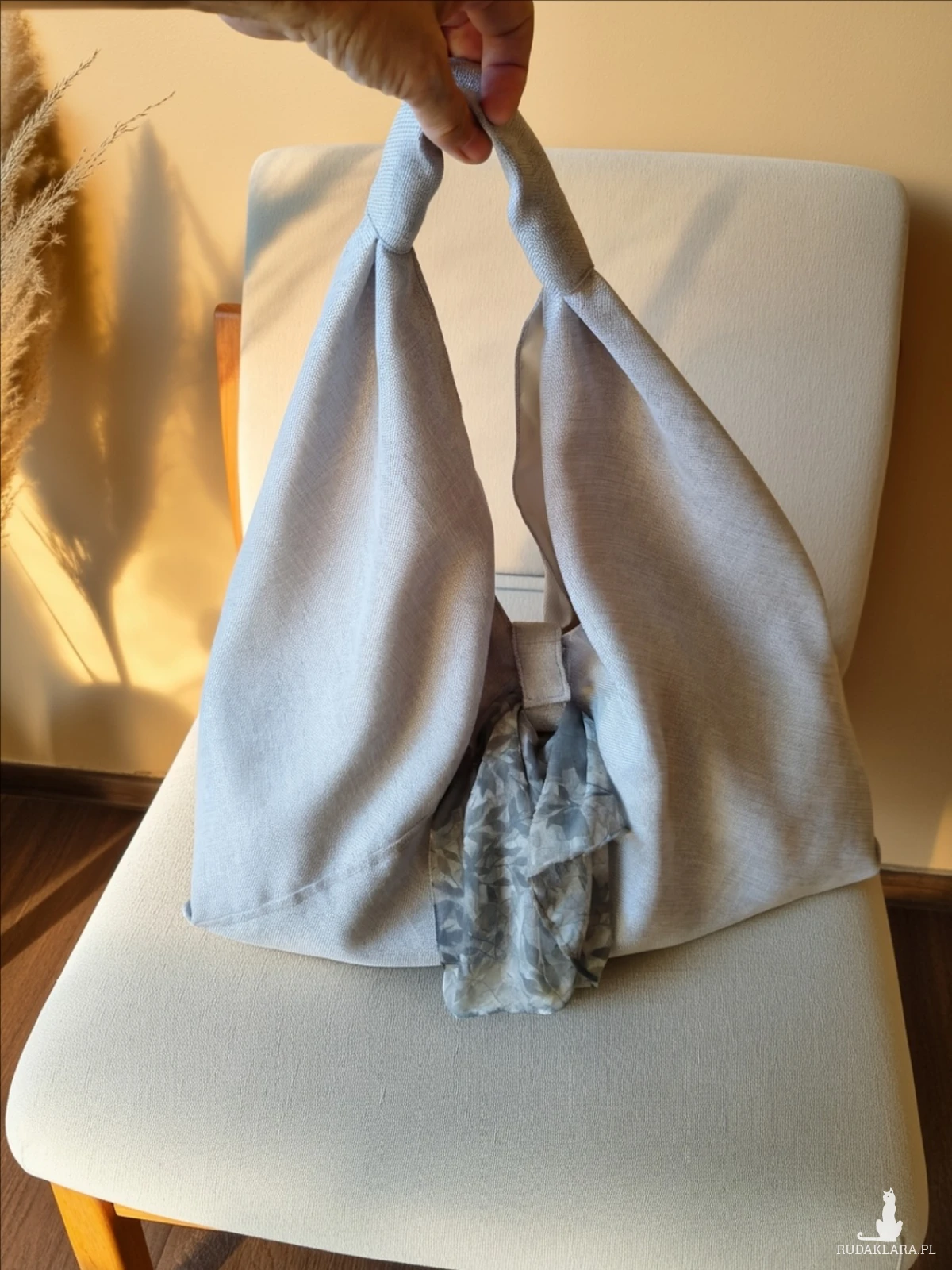 Torba Azuma na ramię wykonana japońską techniką Origami z tkaniny poliestrowej imitującej grube płótno: ręcznie robiona torba, może być zastosowana jako damska torebka albo torba na zakupy. Można nosić na ramieniu bądź w ręku. Na ramieniu dobrze się układa pod pachą. W środku kremowa podszewka, oraz kieszeń przedzielona na 2 części, w jednej mieści się smartfon. Torba zapinana na napkę, do pateczki przymocowana ozdoba z żorżety poliestrowej. Torba jest bardzo duża, na jednym zdjęciu dla zobrazowania wielkości na torbie leży teczka A4. Bardzo fajna i wygodna, tkanina jest w kolorze srebrnym z lekkim połyskiem. Wymiary: Szerokość ok. 62 cm, dł. w najwęższym miejscu 35 cm, głębokość 11 cm.