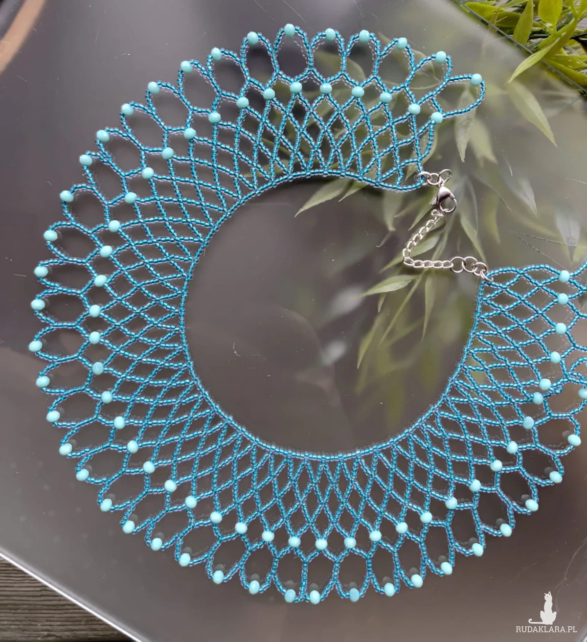 Naszyjnik wypleciony z pięknych transparentnych koralików w kolorze delikatnego turkusu. Koraliki drobne ok 2 mm, a w całość wplecione turkusowe szklane oponki w kolorze jasnego turkusu. Całość tworzy piękną koronkę, szeroką na 6,5 cm, objętość naszyjnika 40 cm, można nosić z zapięciem z przodu jako kołnierzyk