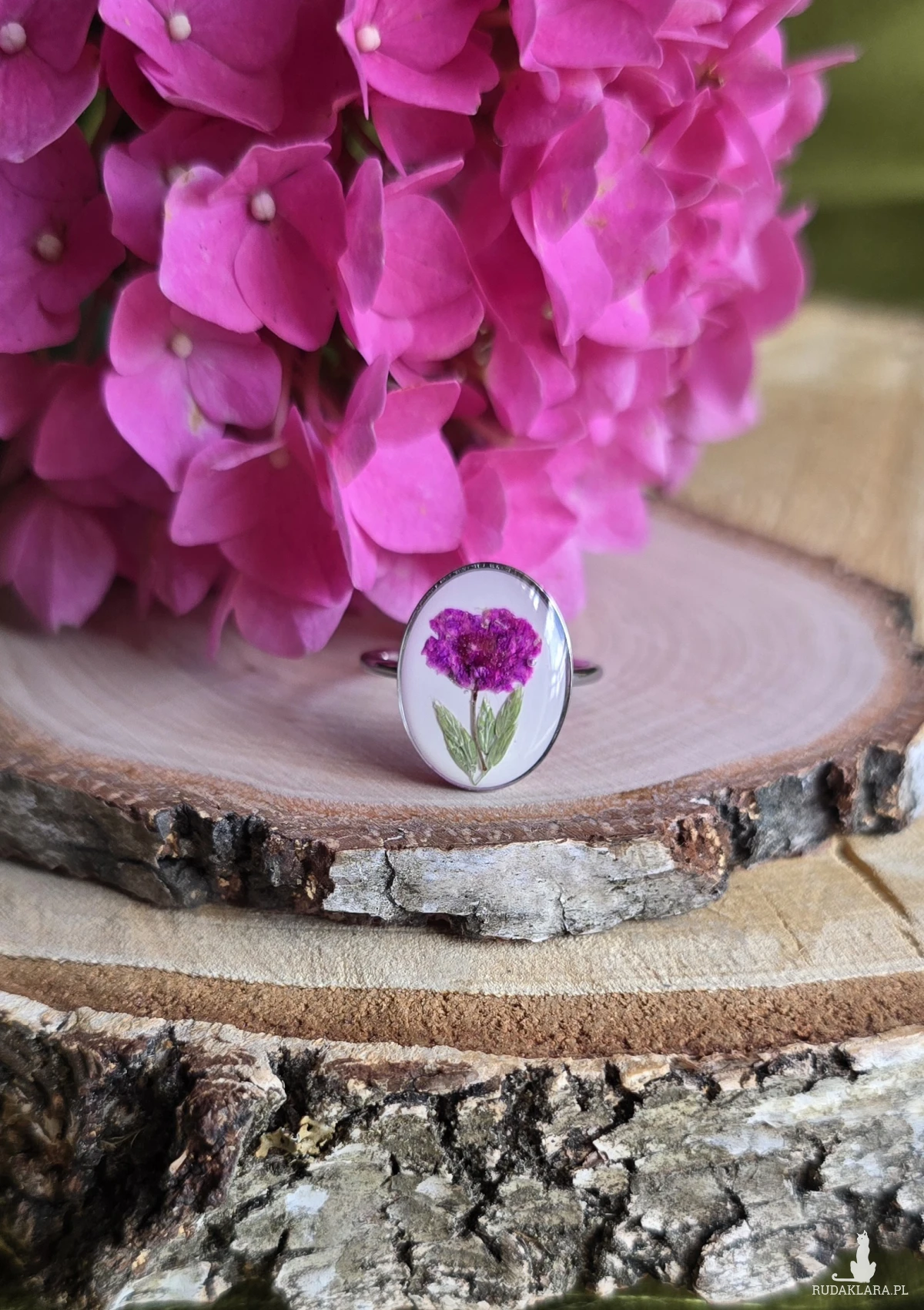 Oferuję Państwu unikalną biżuterię. Pierścionek jest wykonany z suszonych kwiatów i żywicy epoksydowej. Biżuteria jest wspaniałym i oryginalnym prezentem na lata.