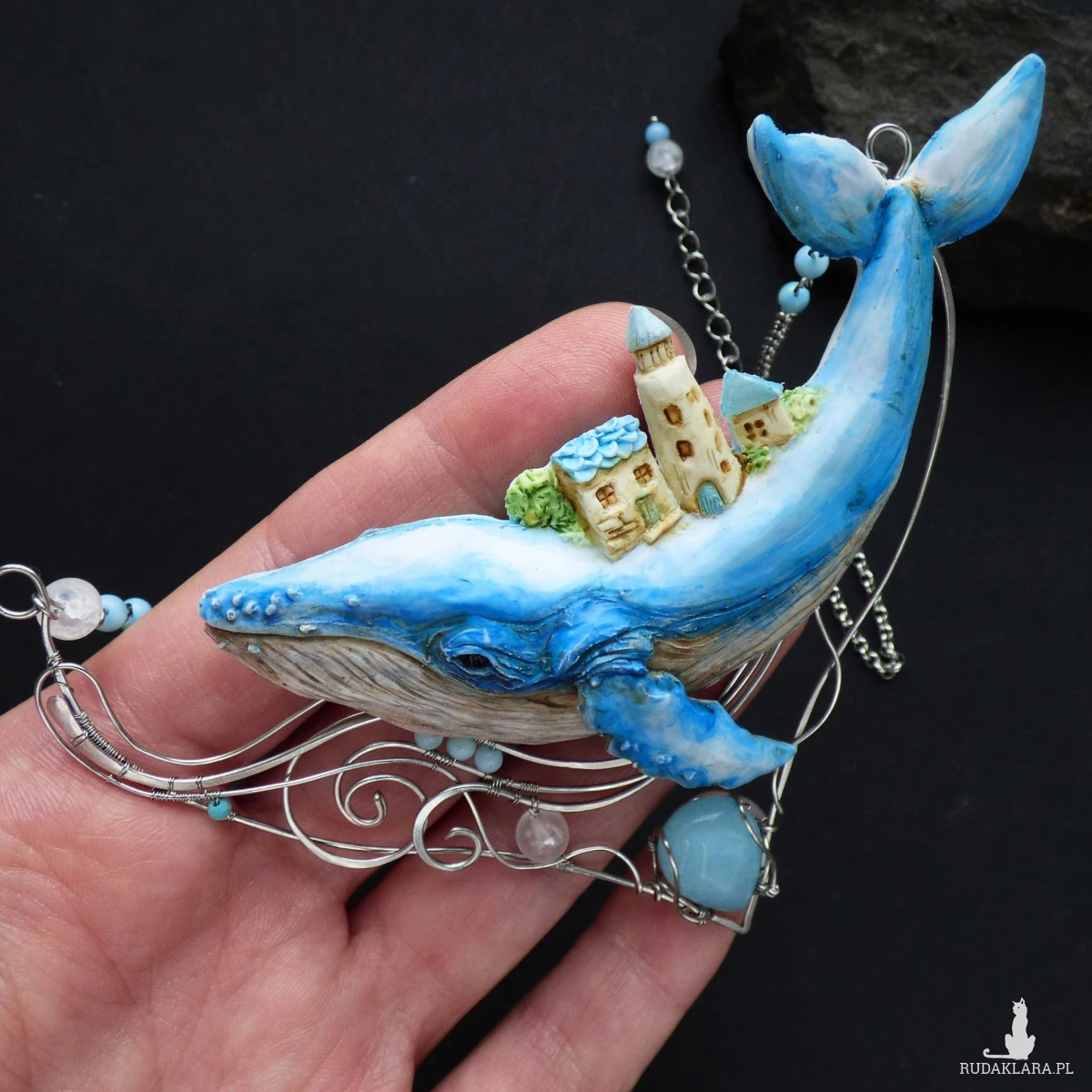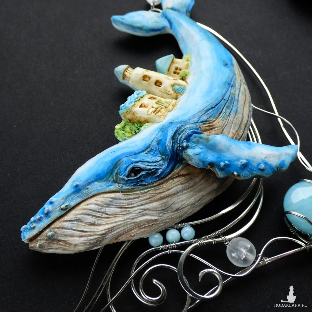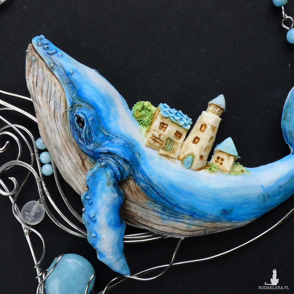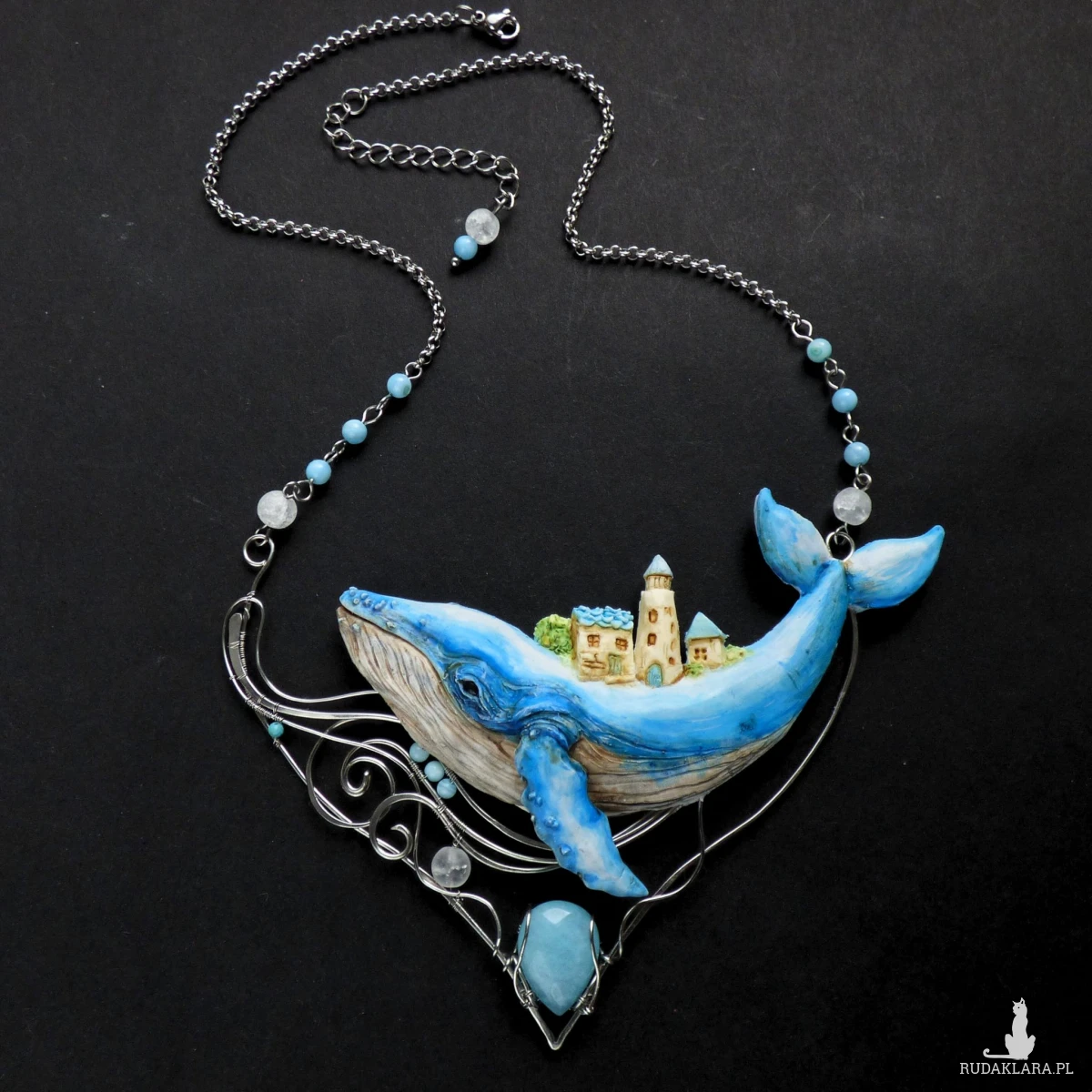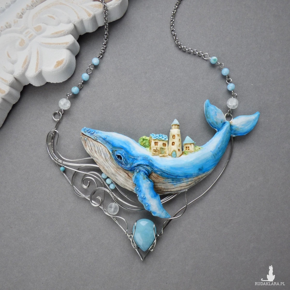 Naszyjnik został w całości wykonany ręcznie z glinki polimerowej i drutu ze stali szlachetnej oraz ozdobiony naturalnymi kamieniami. Wieloryb został od podstaw wyrzeźbiony ręcznie z glinki polimerowej. Elementy z drutu zostały wykonane w technice wire wrapping i ukształtowane tak, aby przypominały fale oceanu. Uzupełnieniem kompozycji są błękitne kamienie: łezka jadeitu, drobne kulki z masy perłowej oraz kuleczka fasetowanego turkusu, a także matowe kulki lodowego kryształu górskiego, przywodzące na myśl spienione fale morskie.