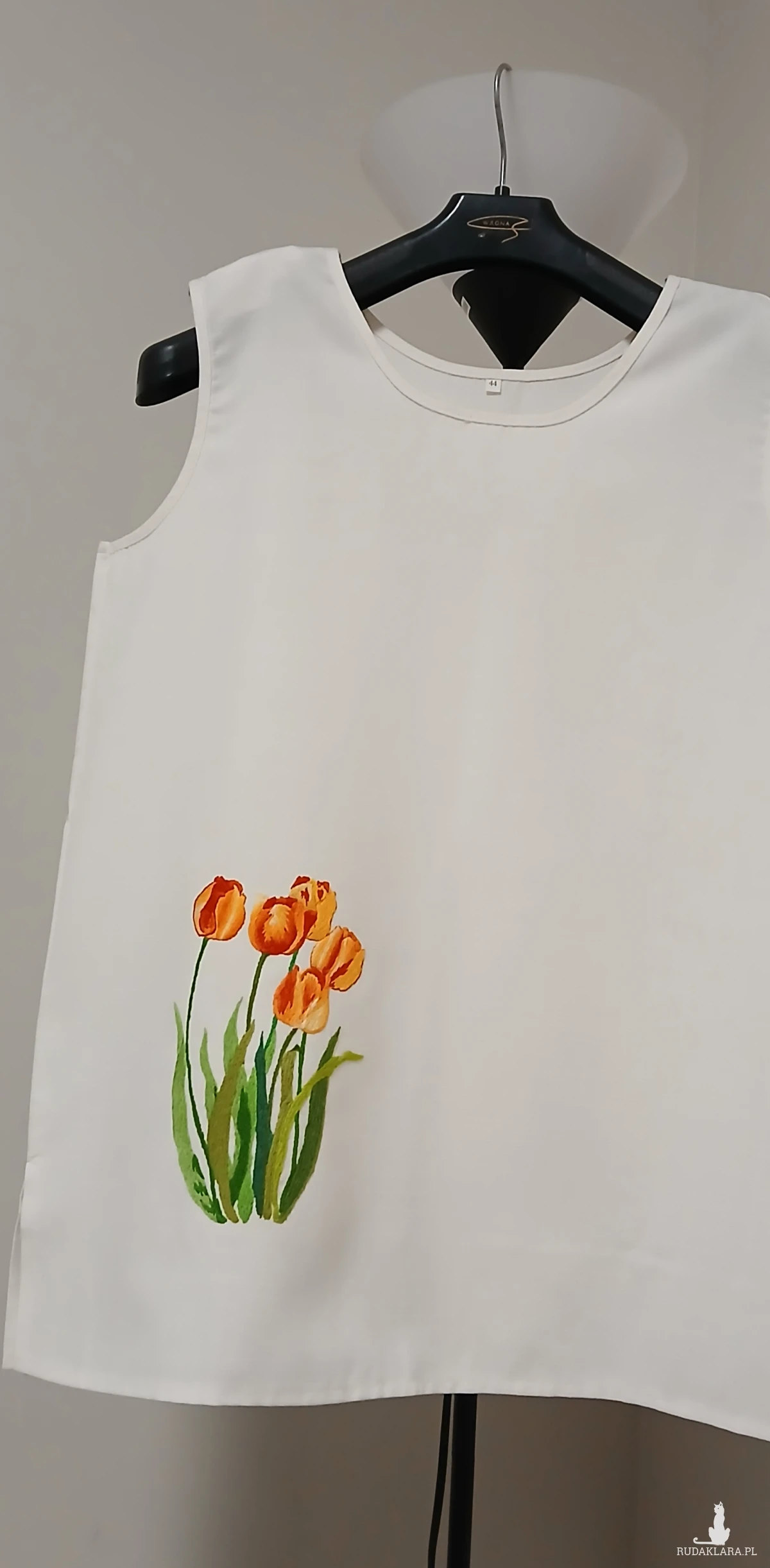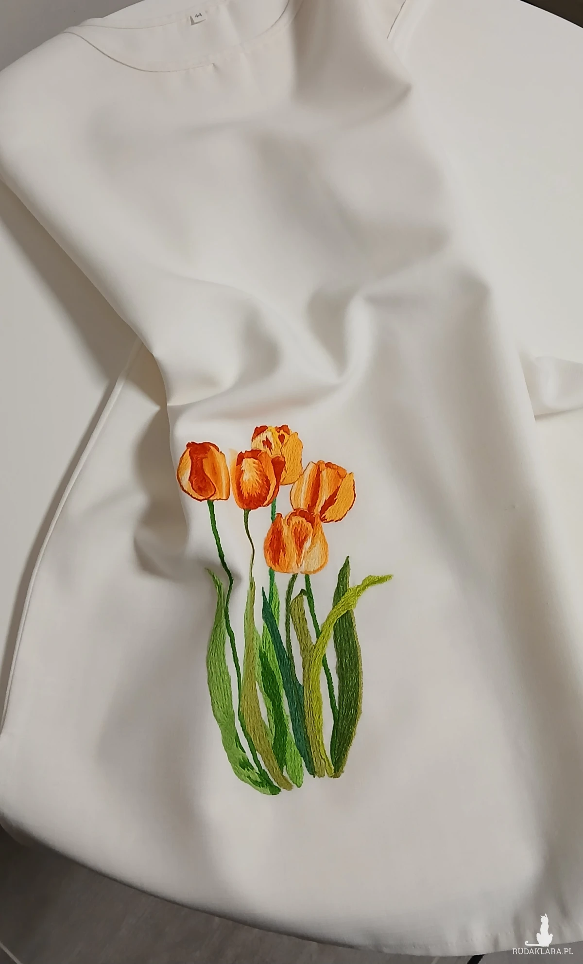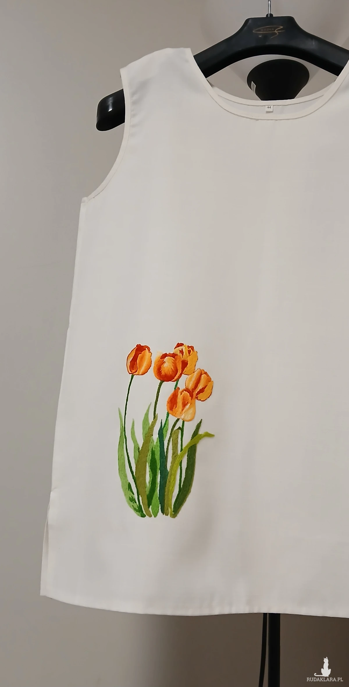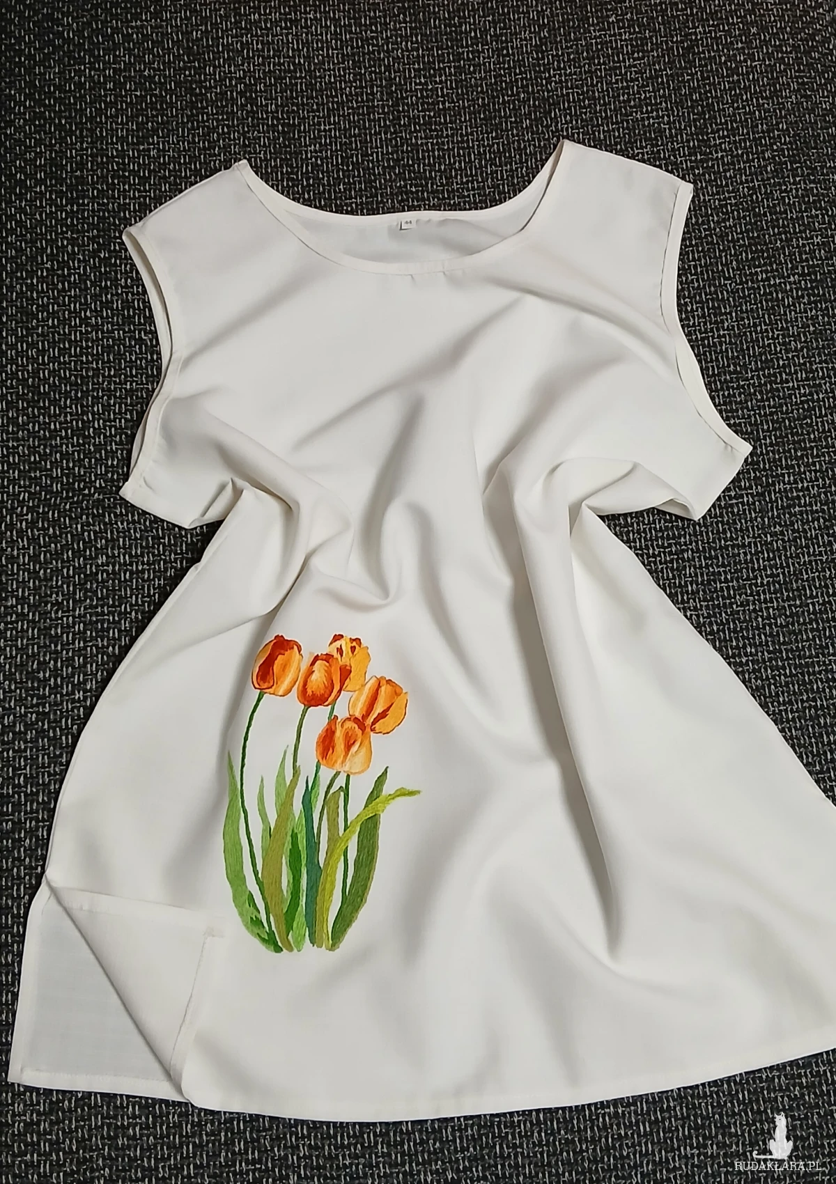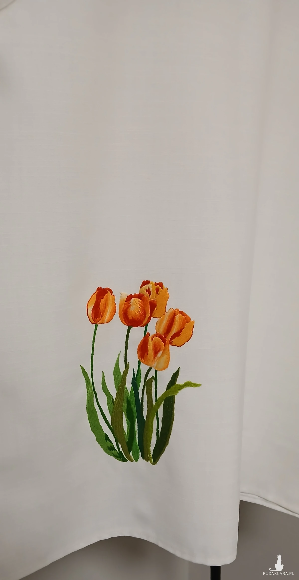 Ręcznie haftowany bukiet tulipanów na białej bluzeczce. Prawdziwy rarytas modowy dla każdej pani, która chce się wyróżniać. Faktura materiału jest miękka i w dotyku przypomina bawełnę, a fakt że jest to viscoza i poliester dowodzi że bluzka nie będzie się nadmiernie gniotła.