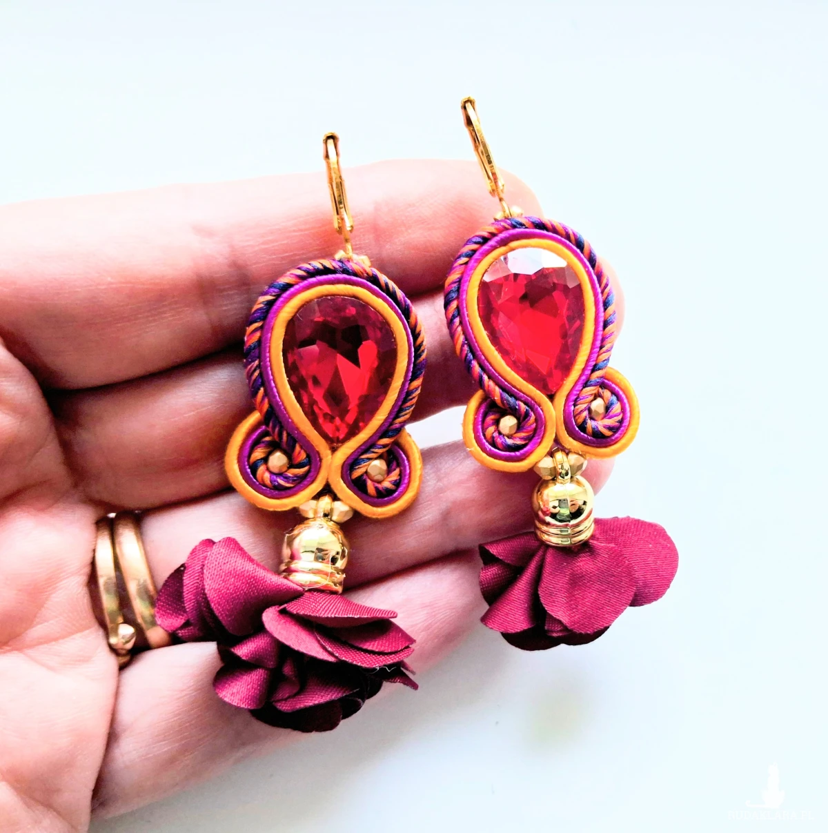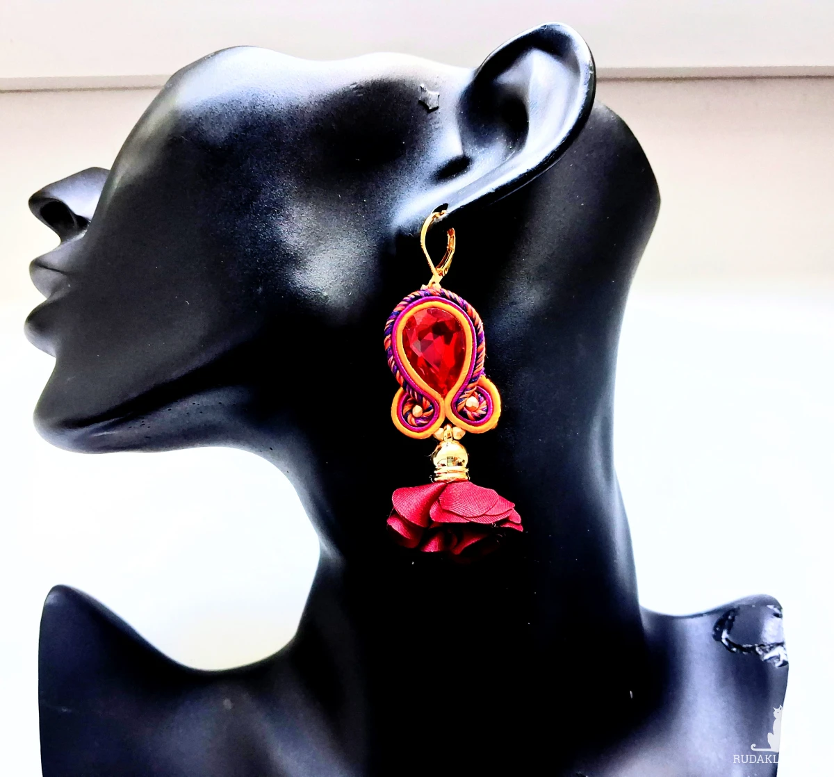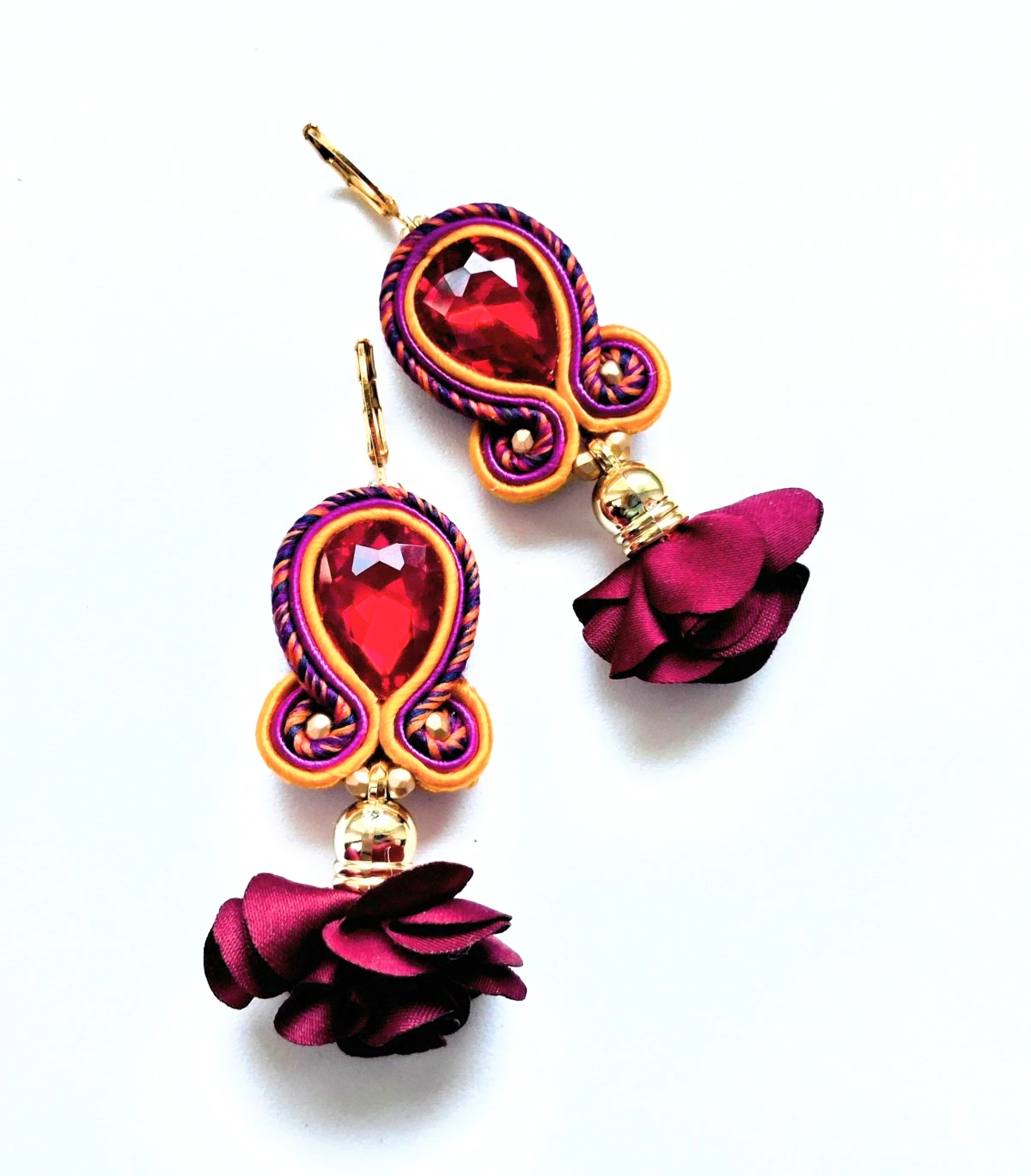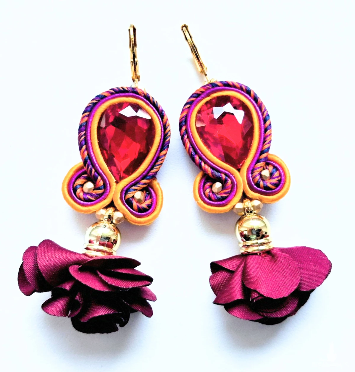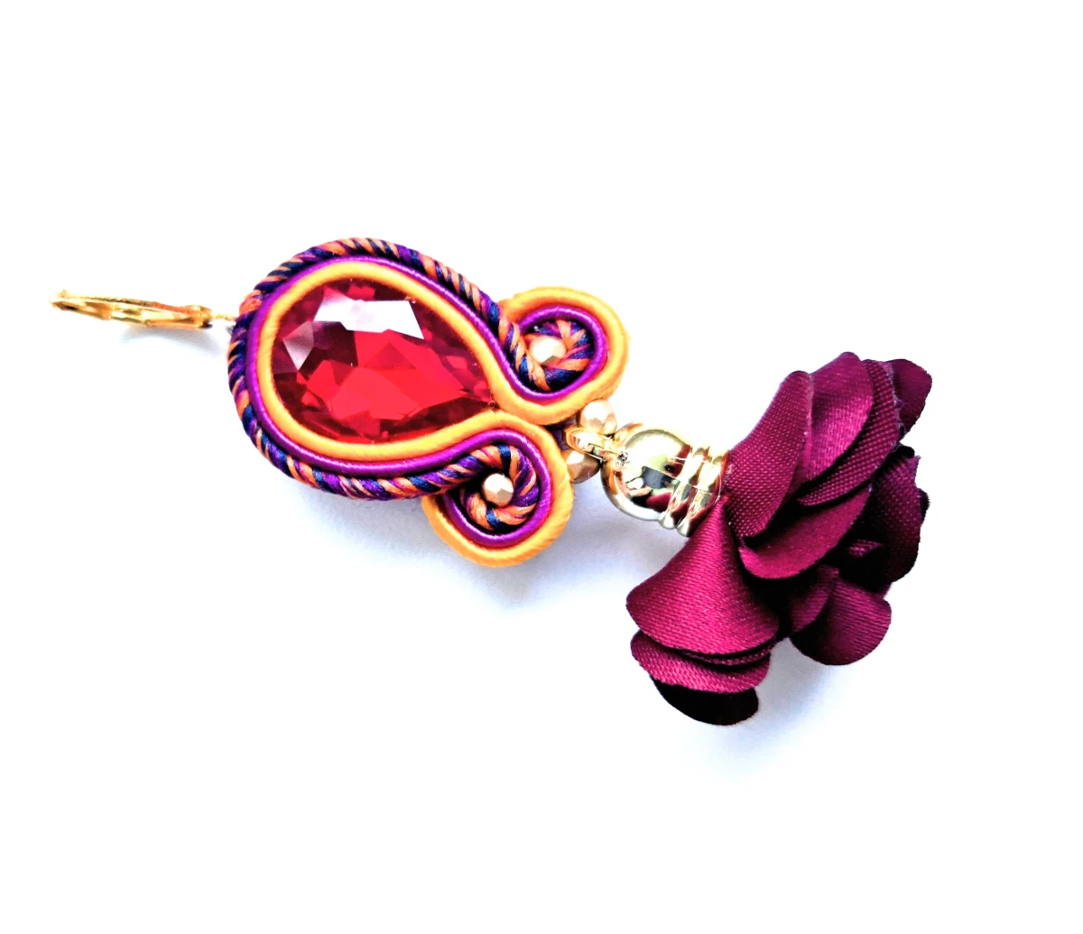Materiał: sutasz, kwiat satynowy, koraliki Fire Polish, kryształ szlifowany.