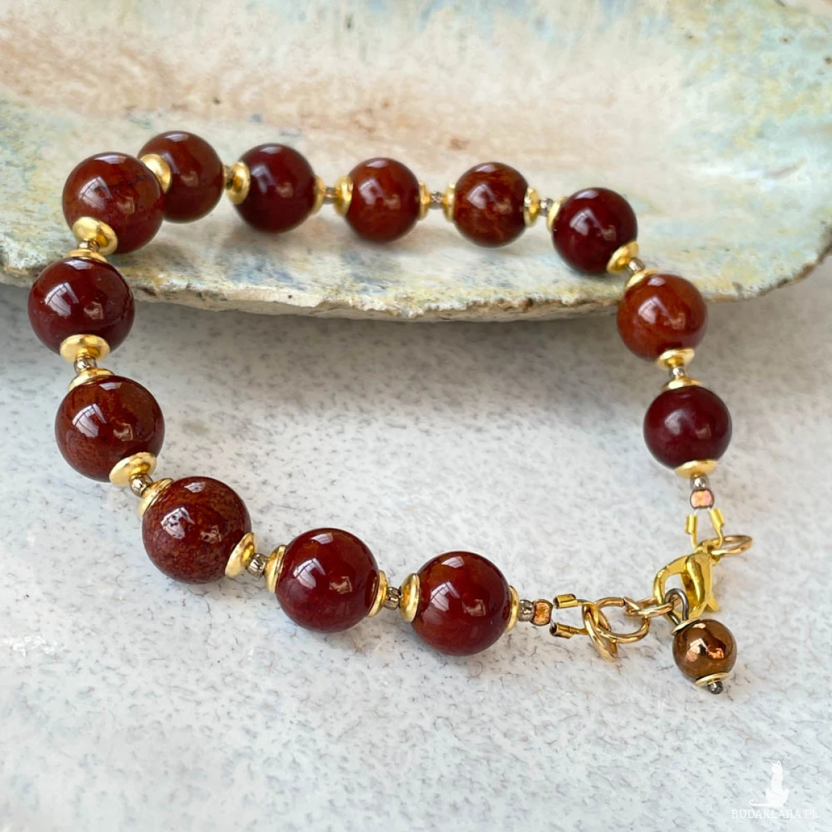 Bransoletka wykonana z brązowego turkusu o wielkości kamieni 10 mm, wykończona pozłacanymi elementami ze stali chirurgicznej. Między kamieniami znajdują się subtelne koraliki Toho, które dodają elegancji i delikatności. Bransoletka łączy w sobie naturalne piękno kamieni z nowoczesnym designem. Sprawdzi się nie tylko jako dodatek, ale również jako prezent dla bliskiej osoby.