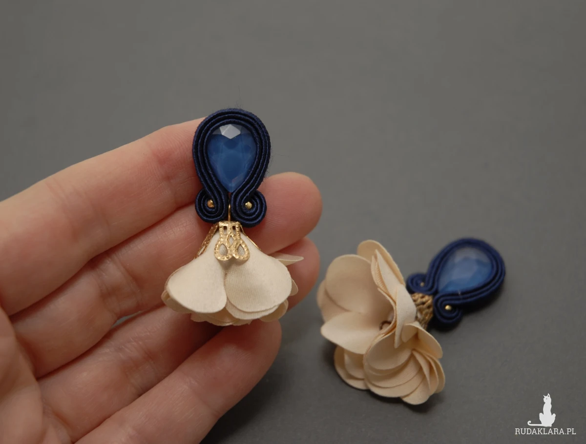 granatowo-kremowe kolczyki lub klipsy sutasz z kwiatkami