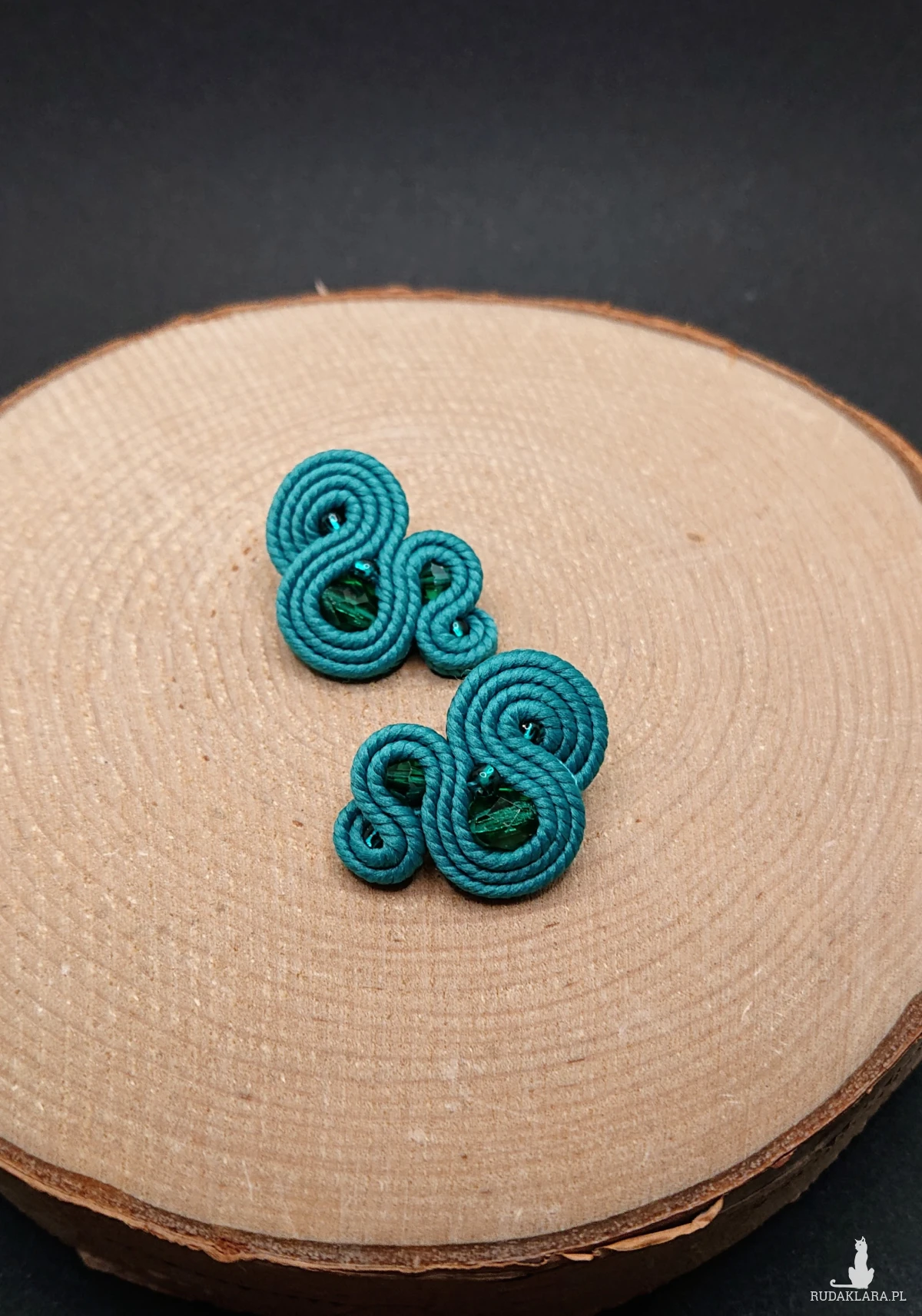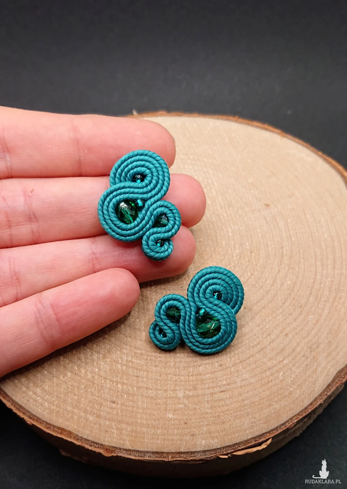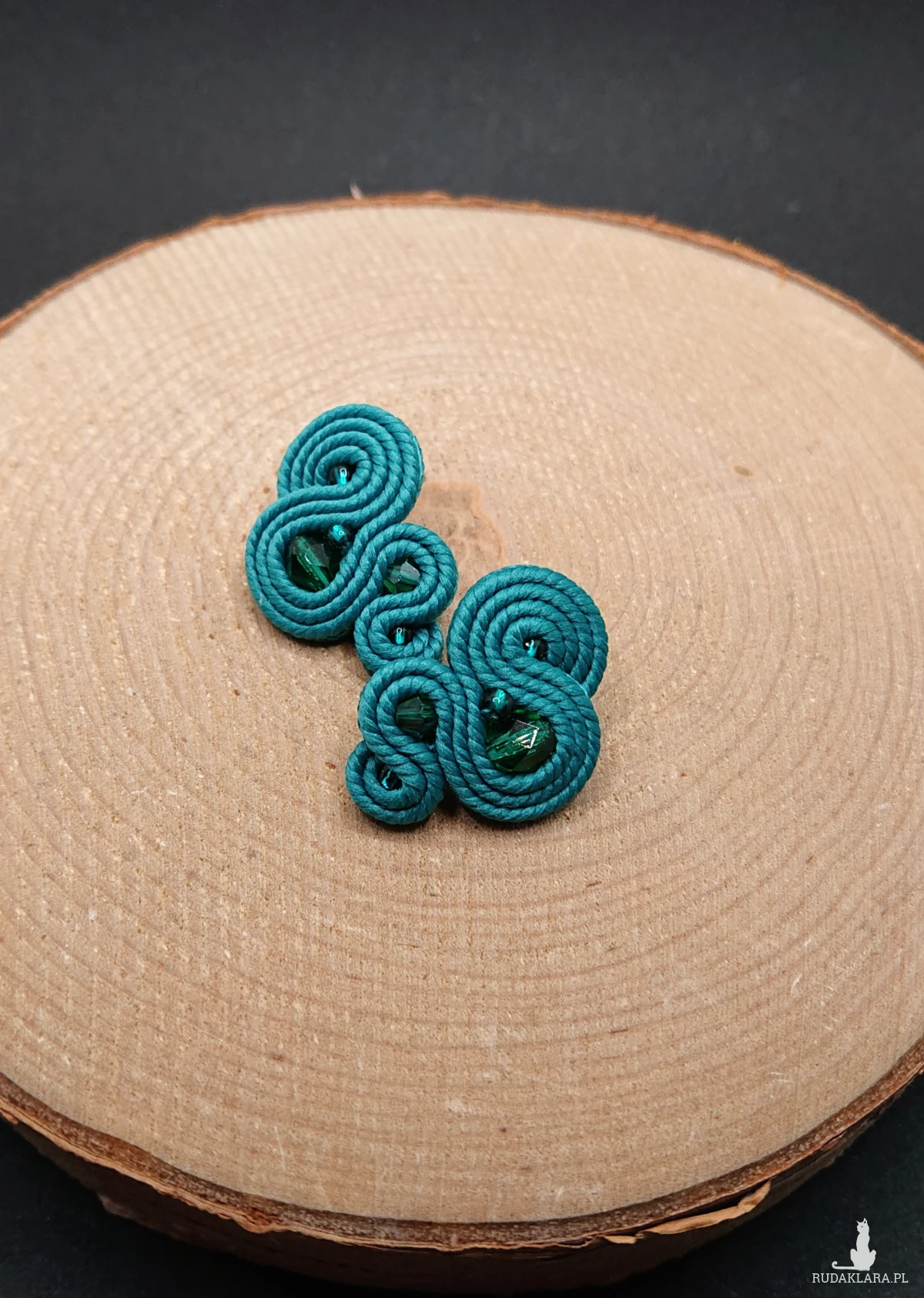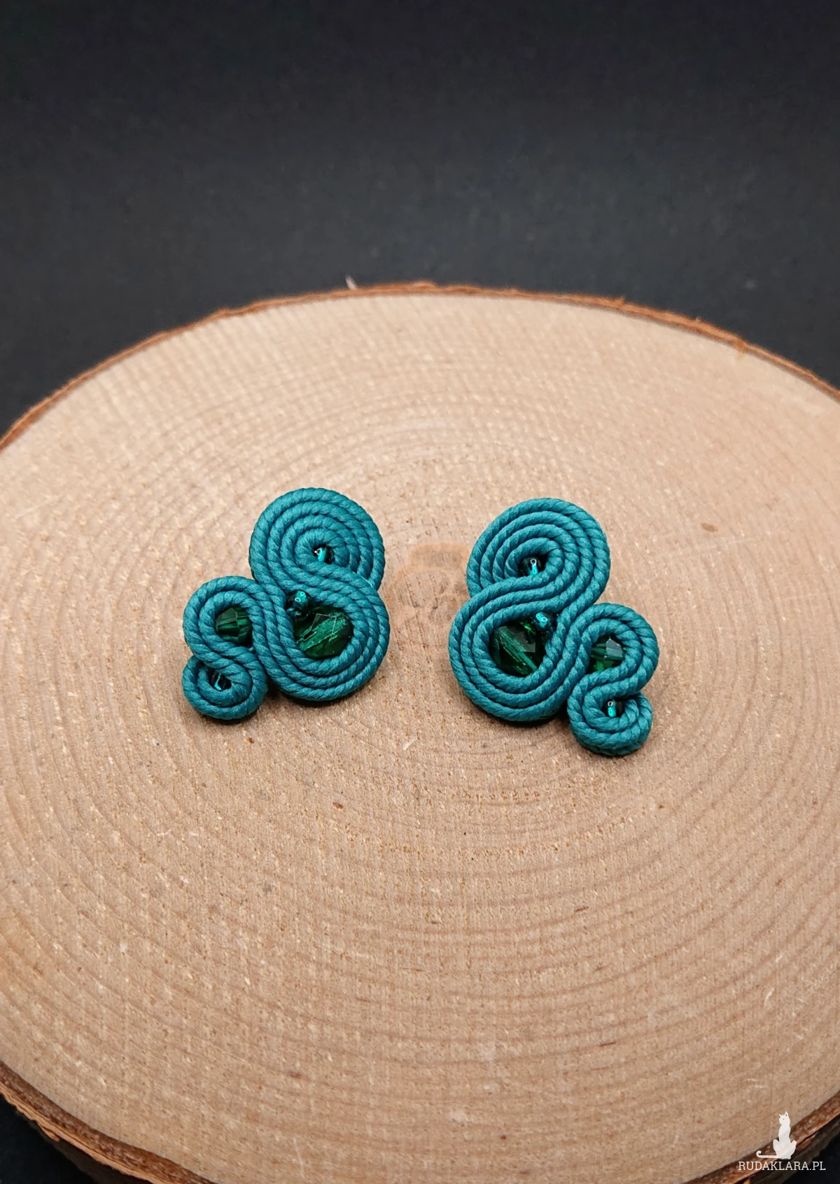 Niewielkie kolczyki sutasz wykonane z szklanych koralików oraz polskich sznurków sutasz. Kolory w kolczykach: ciemny turkus, morski. Kolczyki zamocowane na sztyftach ze stali chirurgicznej.