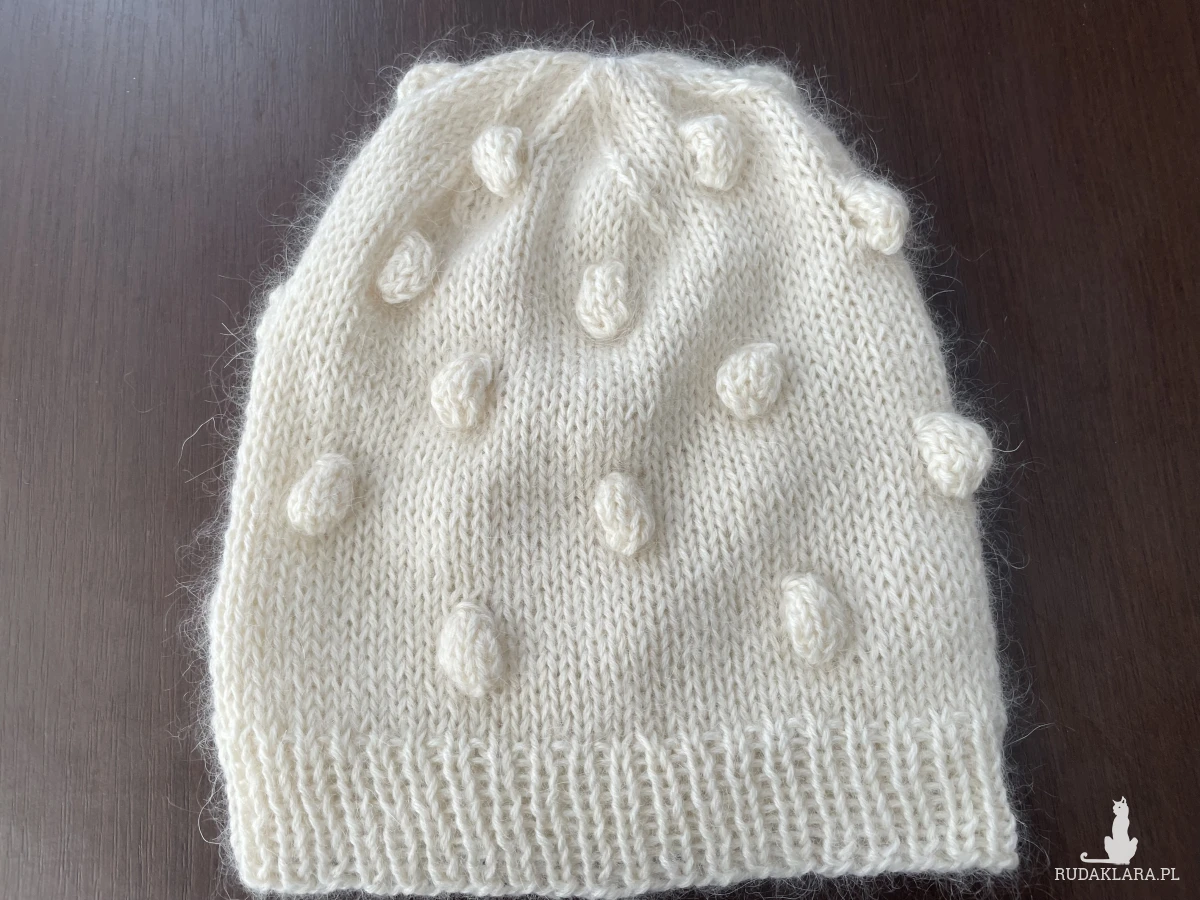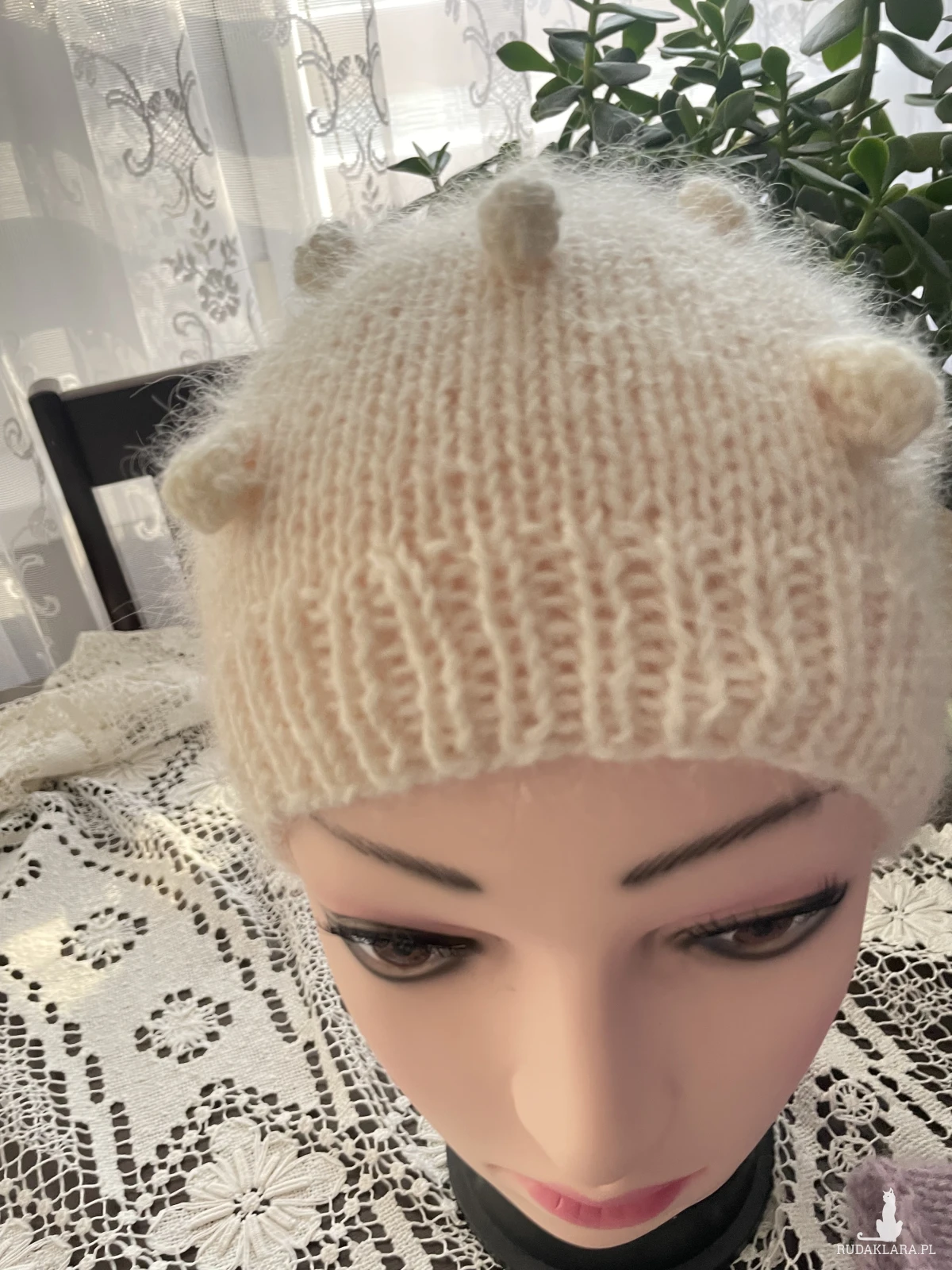 Czapka wykonana ręcznie na drutach z mieszanki wełny, alpaki i jedwabiu. Obwód głowy ok 54 cm.
