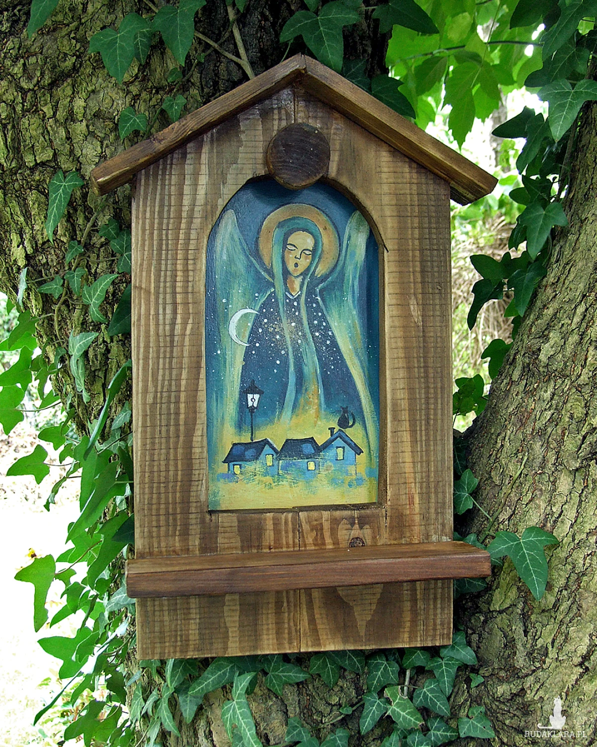 Kapliczka została docięta ze starej sosnowej deski, która ma ślady wcześniejszego użytkowania (otworki po gwoździach). W desce jest wycięte jakby okienko, a w nim zamontowany jest ręcznie malowany obrazek z aniołem. Obrazek jest namalowany na cienkiej sklejce, farbami akrylowymi - cała kapliczka jest zabezpieczona matowym lakierem akrylowym, nietoksycznym i wodoodpornym.
