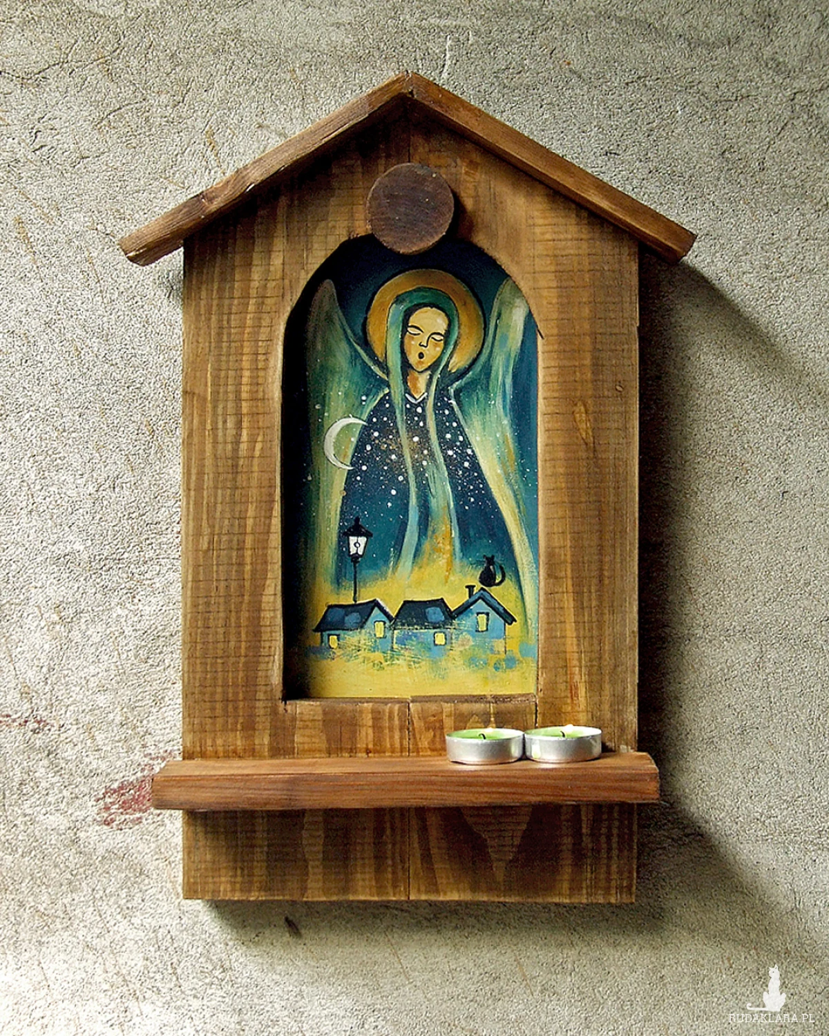 Drewniana Kapliczka - klimatyczna i pełna uroku dekoracja wnętrza. Może być także zawieszona w ogrodzie - w miejscu osłoniętym od deszczu, albo na werandzie. Taka kapliczka to także miły, oryginalny prezent do nowego domu.