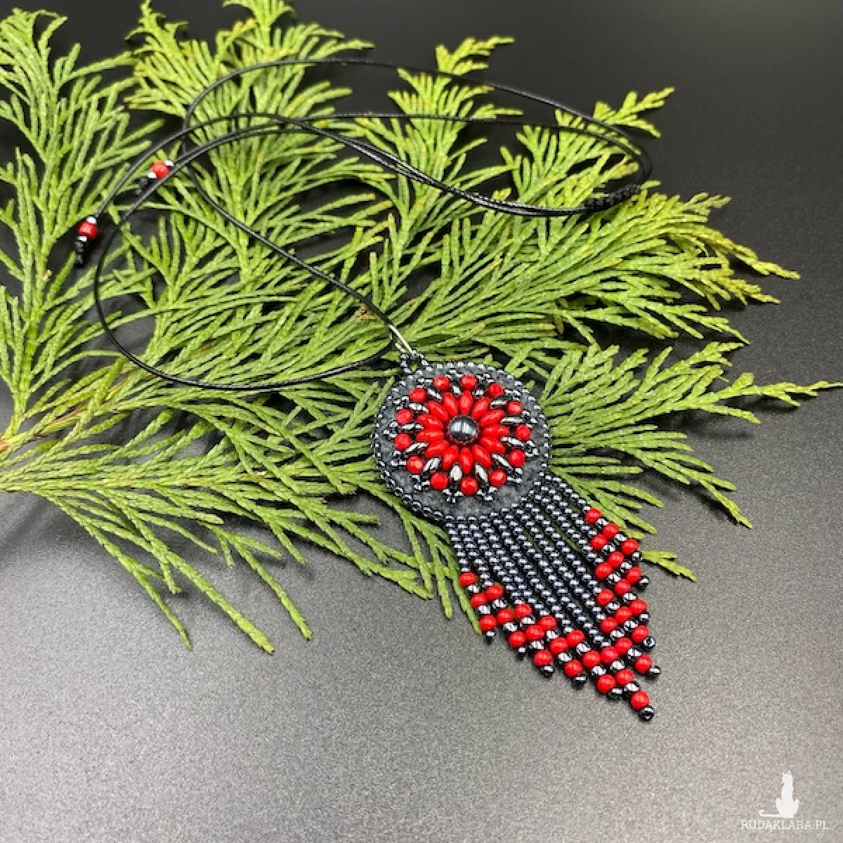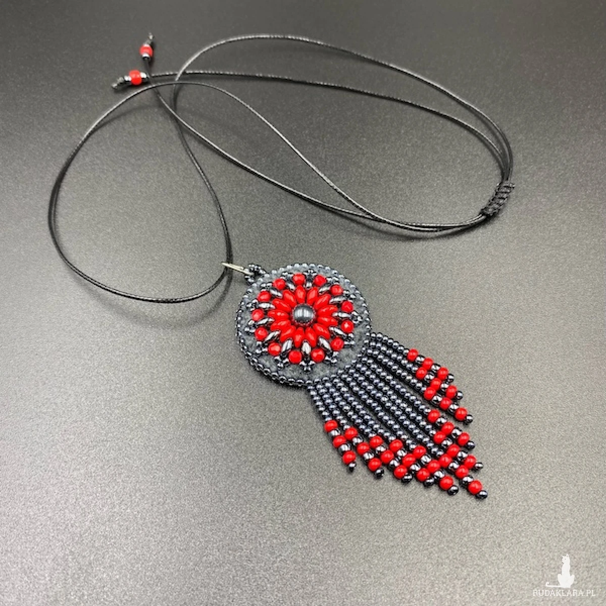 Kolory wisiorka: hematytowy, czerwony. Zawieszony został na sznurku powlekanym czarnym. Tył podszyty czarną eko skórką. Elementy metalowe ze stali chirurgicznej w kolorze srebrnym.