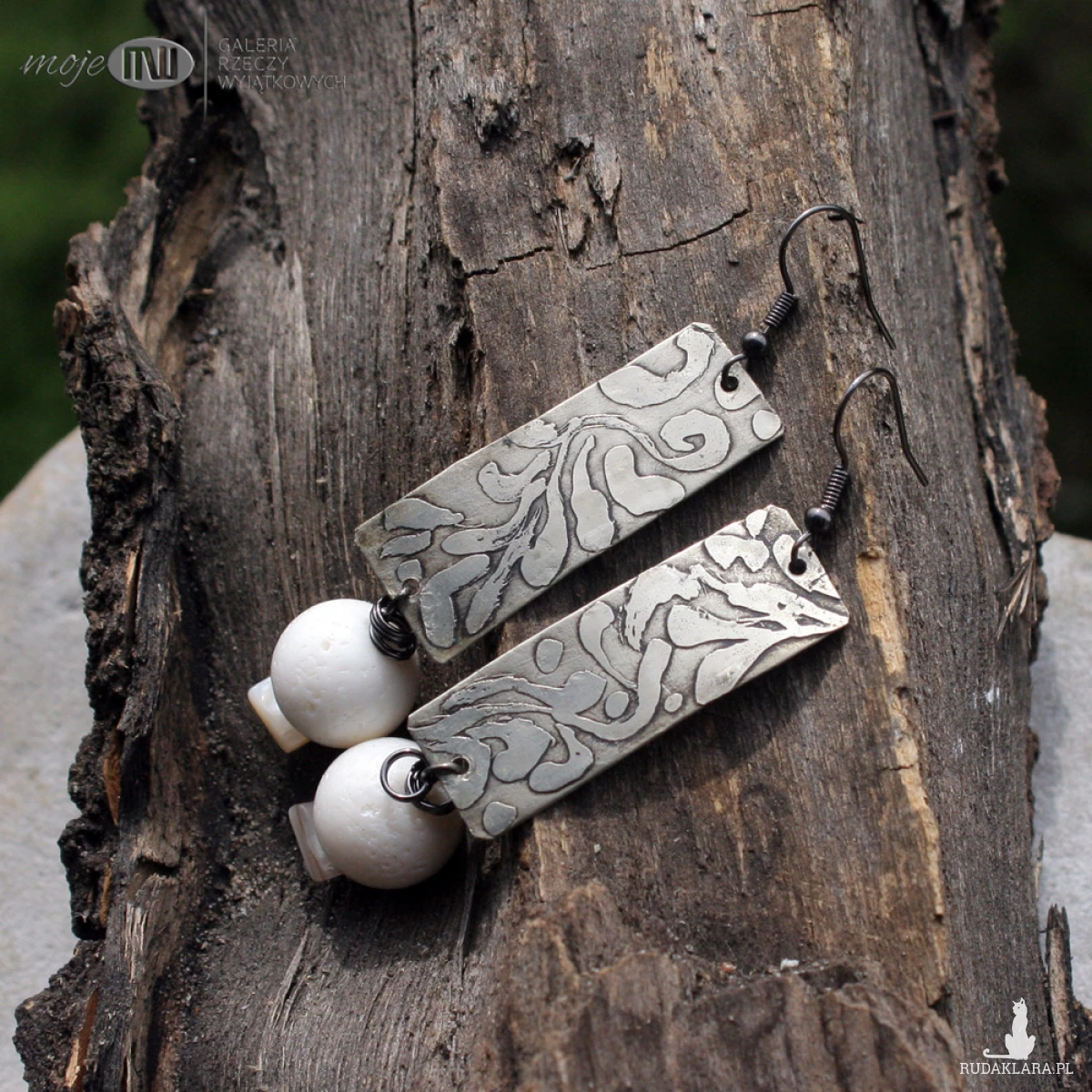 Długie kolczyki z alpaki z wytrawionymi florystycznymi wzorami oraz kuli białego korala. Blaszka jest patynowana i częściowo polerowana dla wydobycia rysunku. Kolczyki są dość duże, wyglądają efektownie. Zawieszone są na metalowych biglach w kolorze grafitowym.