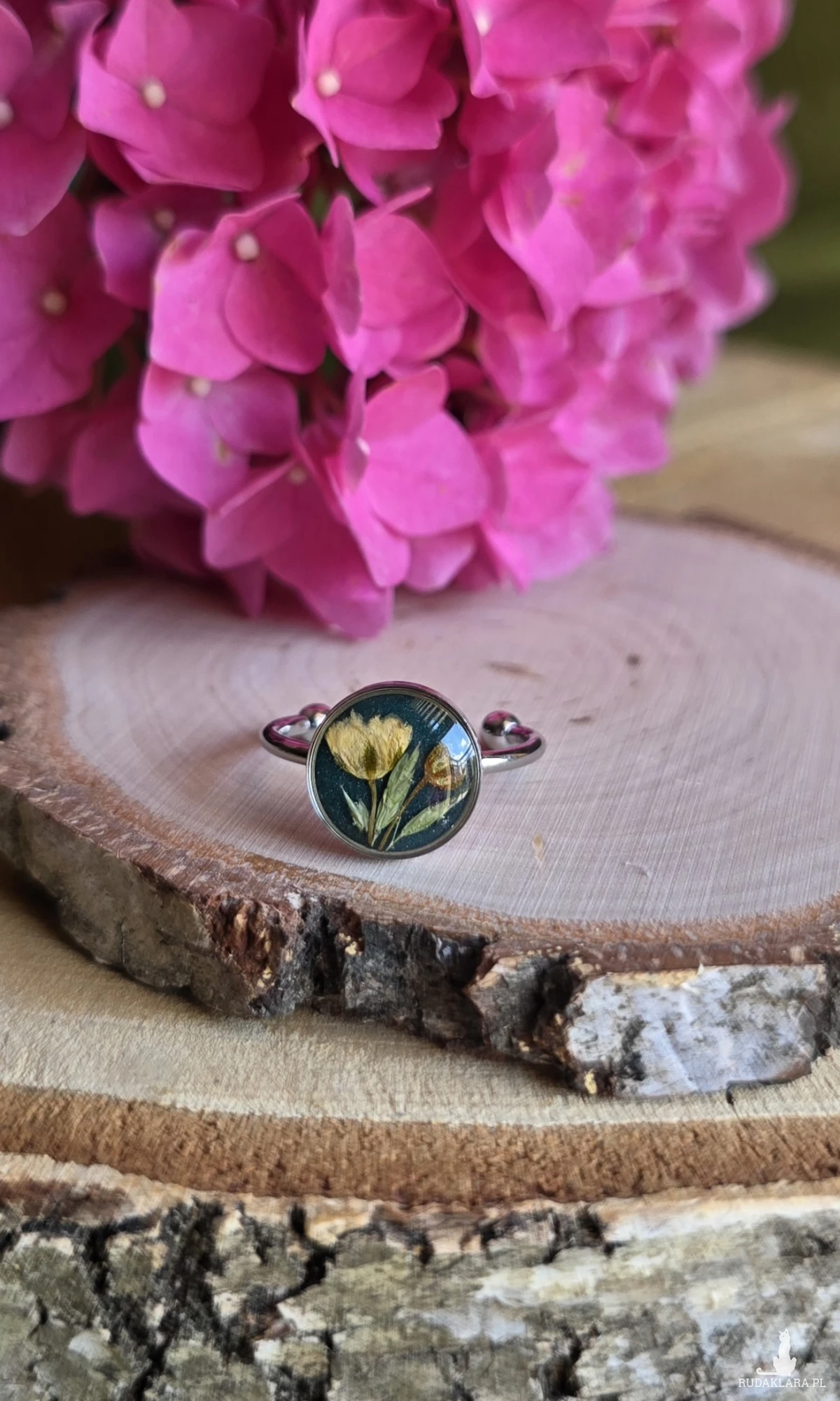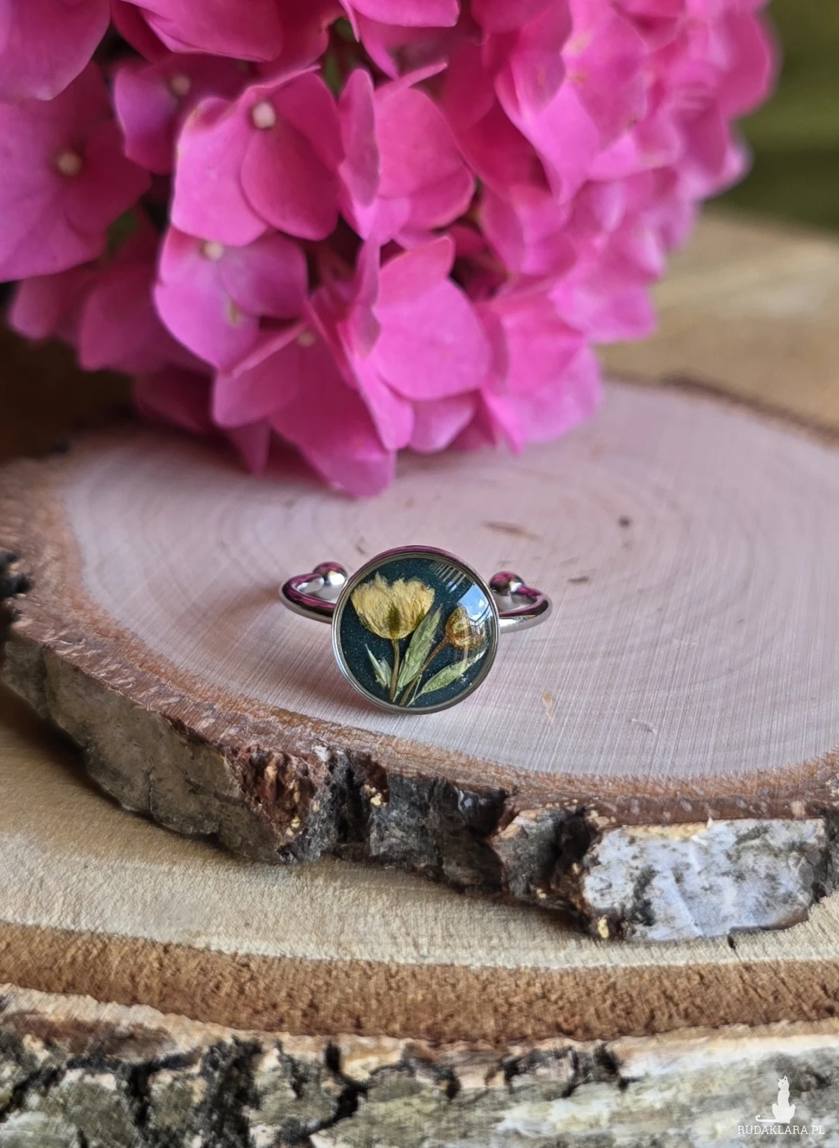 Oferuję Państwu unikalną biżuterię. Pierścionek jest wykonany z suszonych kwiatów i żywicy epoksydowej. Biżuteria jest wspaniałym i oryginalnym prezentem na lata.