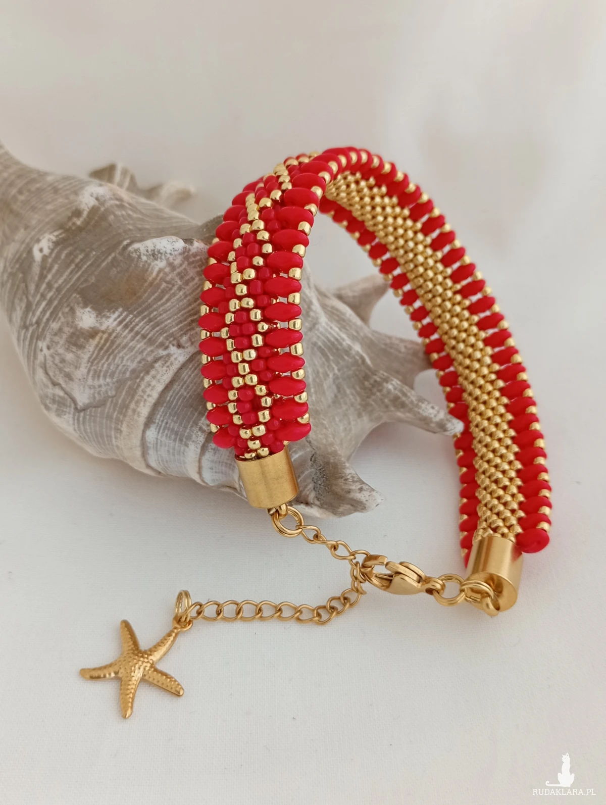Wykonana ręcznie z wysokiej jakości szklanych koralików Toho w kolorze czerwonym i złotym. Na jej brzegach zastosowano dłuższe, również szklane koraliki SuperDuo w kolorze czerwonym.