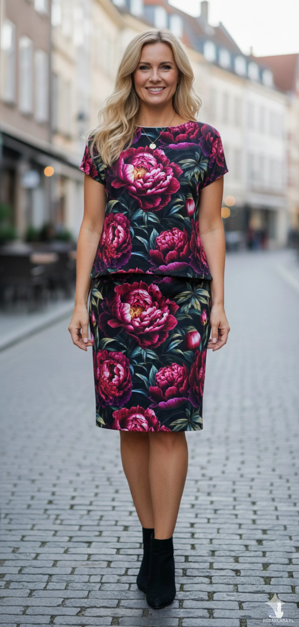 Spódniczka jest uszyta z dresówki pętelki. Bluzka z jerseyu. Piękne żywe kolorowe kwiaty w realu wyglądają obłędnie.