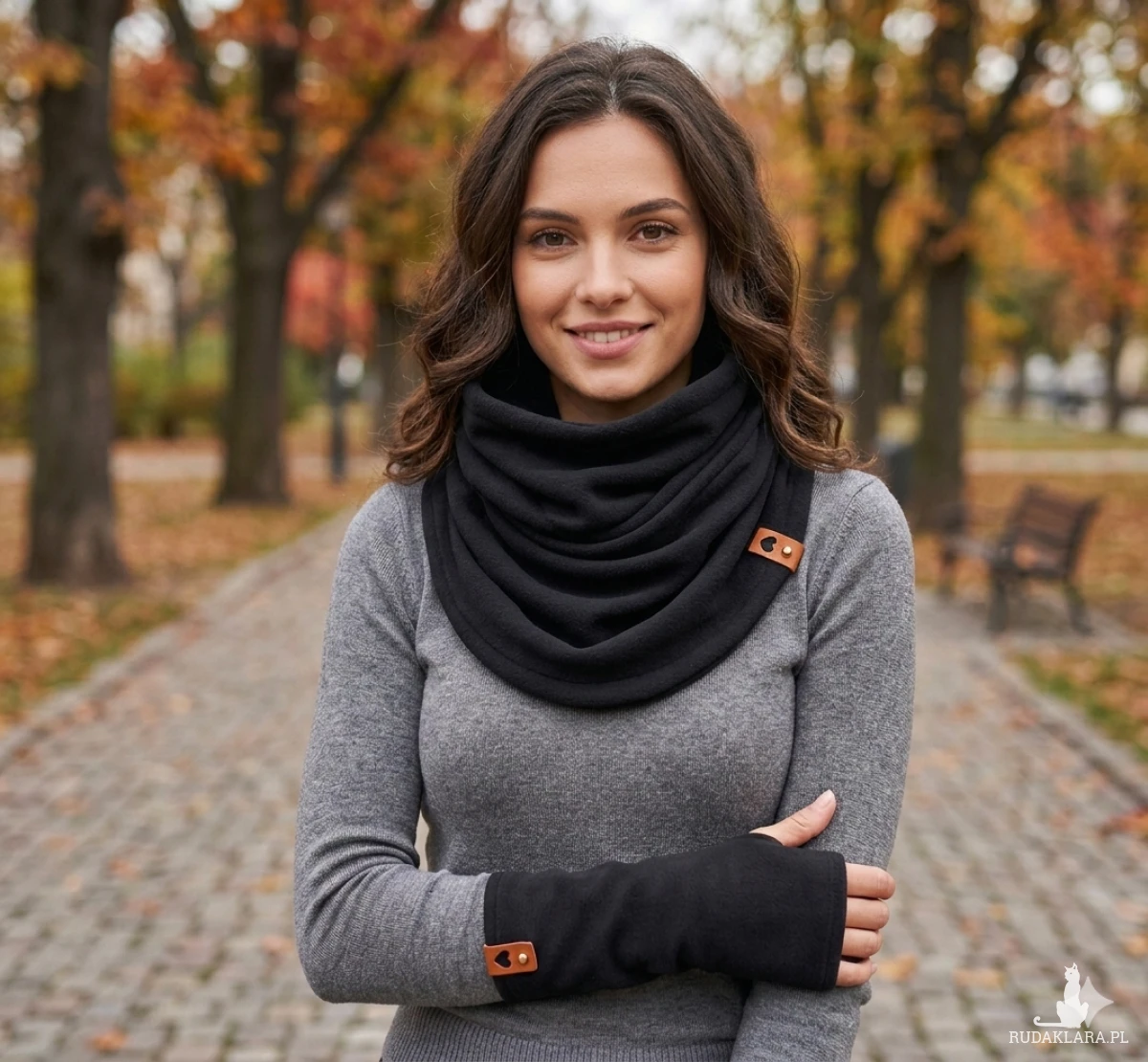 Komplet jest uszyty z dresówki drapanej o gramaturze 270. Ta miękka I przyjemna dzianina z delikatnym meszkiem od wewnątrz ogrzeje Cię w chłodne jesienne dni. Mitenki mają długość 29cm, obwód dłoni 18cm. Komin ma wysokość 60cm i obwód 140 cm.