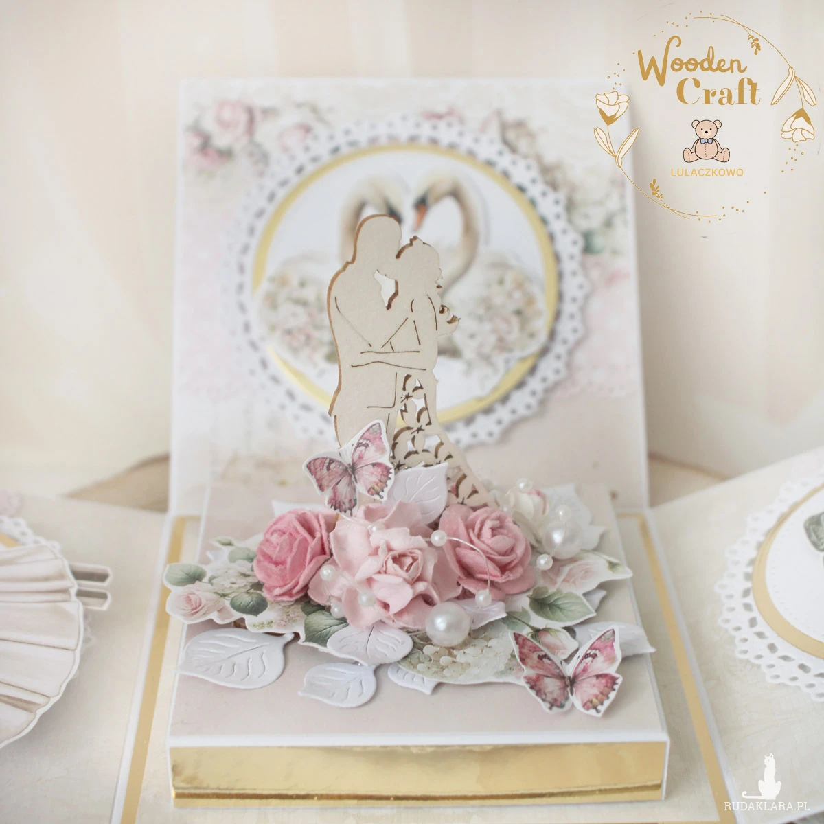 Przepiękny, romantyczny exploding box ślubny, utrzymany w odcieniach beżu, delikatnego różu i bieli z dodatkiem złotych błyszczących akcentów. Box wykonany z dbałością o każdy detal, z przepięknej kolekcji papierów "Today". Wieczko ozdobione koronkową kokardą oraz napisem "W Dniu Ślubu". W środku znajduje się prześliczna tekturka 3D Para Młoda ozdobiona kompozycją z papierowych kwiatów, a pod nią umieszczone zostało mini pudełeczko do którego można włożyć prezent pieniężny. Na ściankach boxa znalazły się grafiki pary łabędzi, sukni ślubnej i garnituru, a także kieliszków i szampana oraz życzenia.
