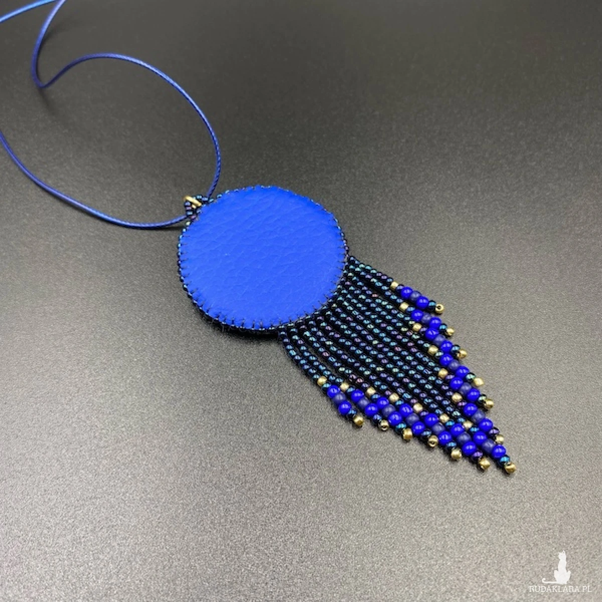 Kolory wisiorka: odcienie granatowego i złota. Zawieszony został na sznurku lakierowanym granatowym. Tył podszyty eko skórką. Element metalowy w kolorze złotym.