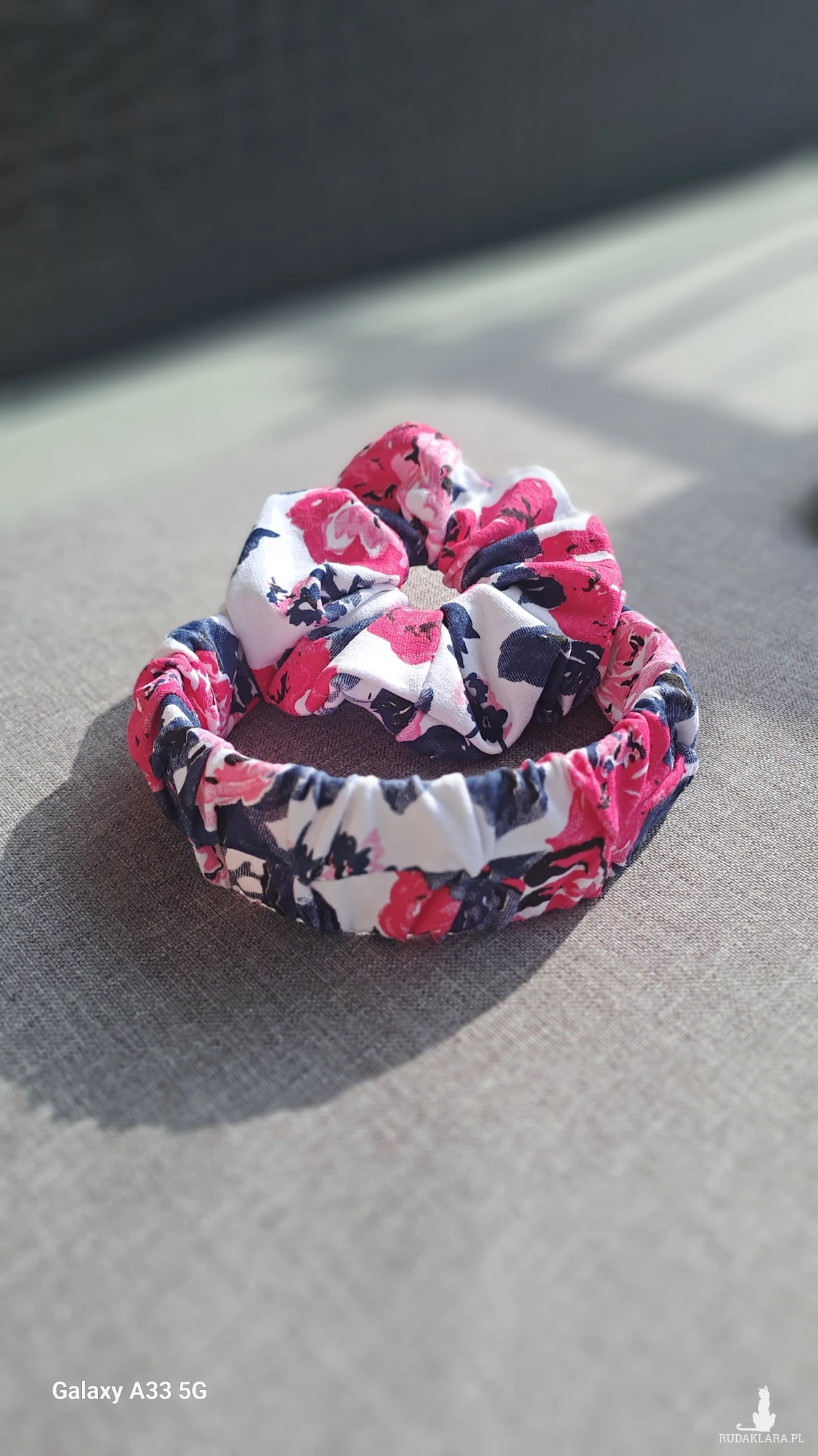 Opaska ma szerokość ok.4,5cm. Scrunchie ma średnicę 12cm.