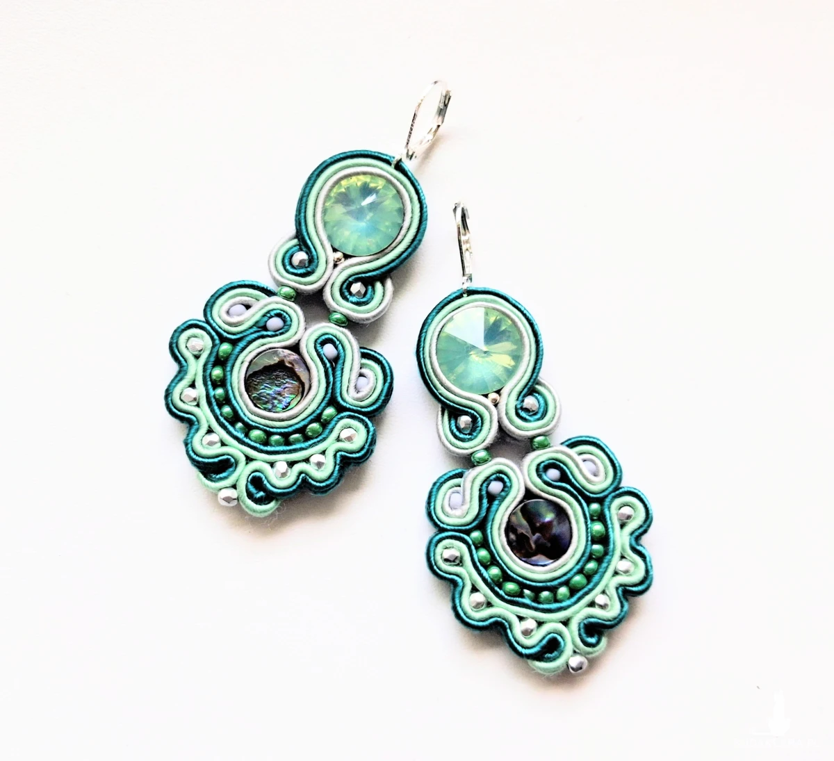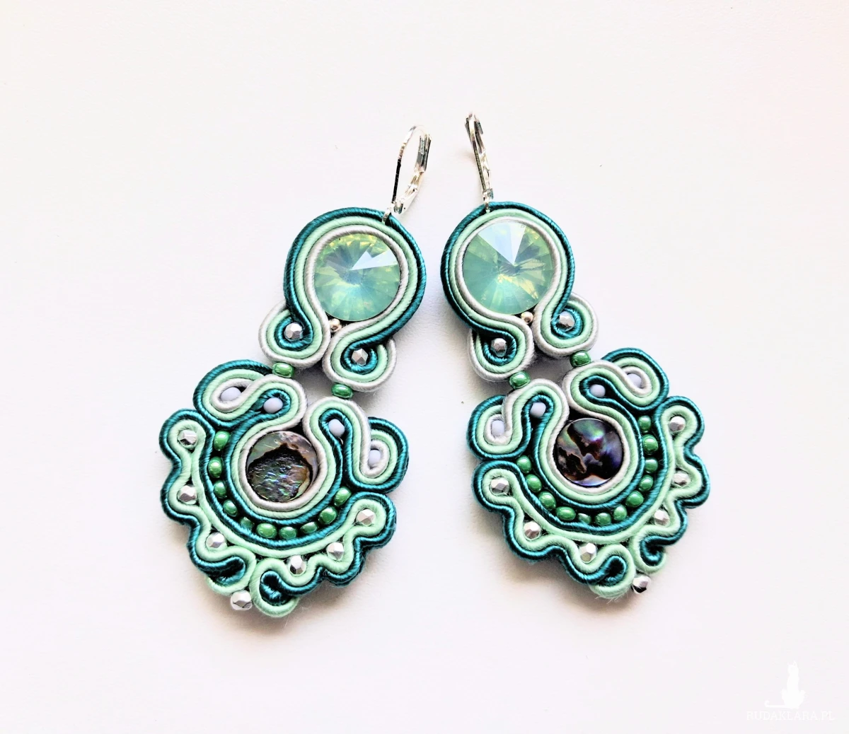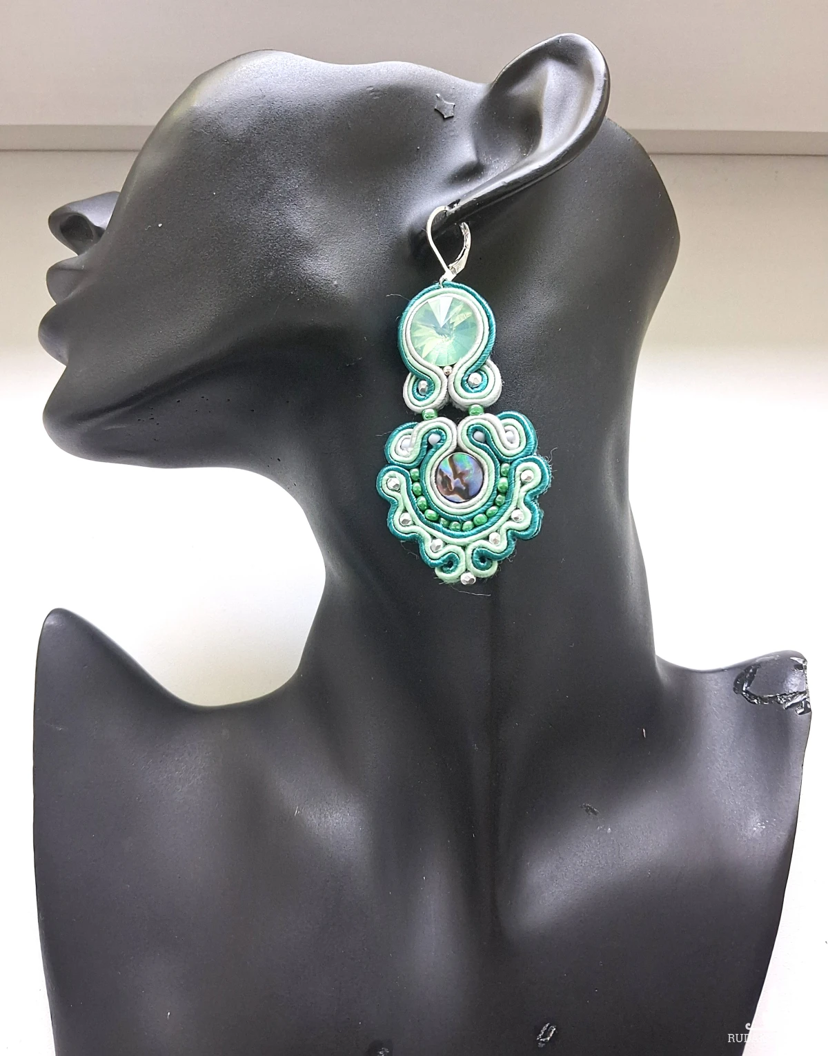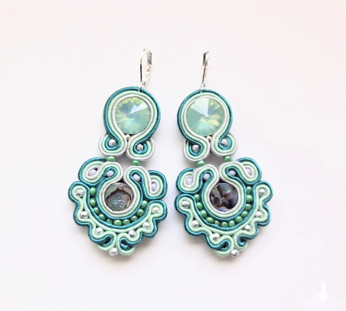 Materiał: sutasz, muszla paua (abalone), koraliki Fire Polish, kryształ szlifowany.