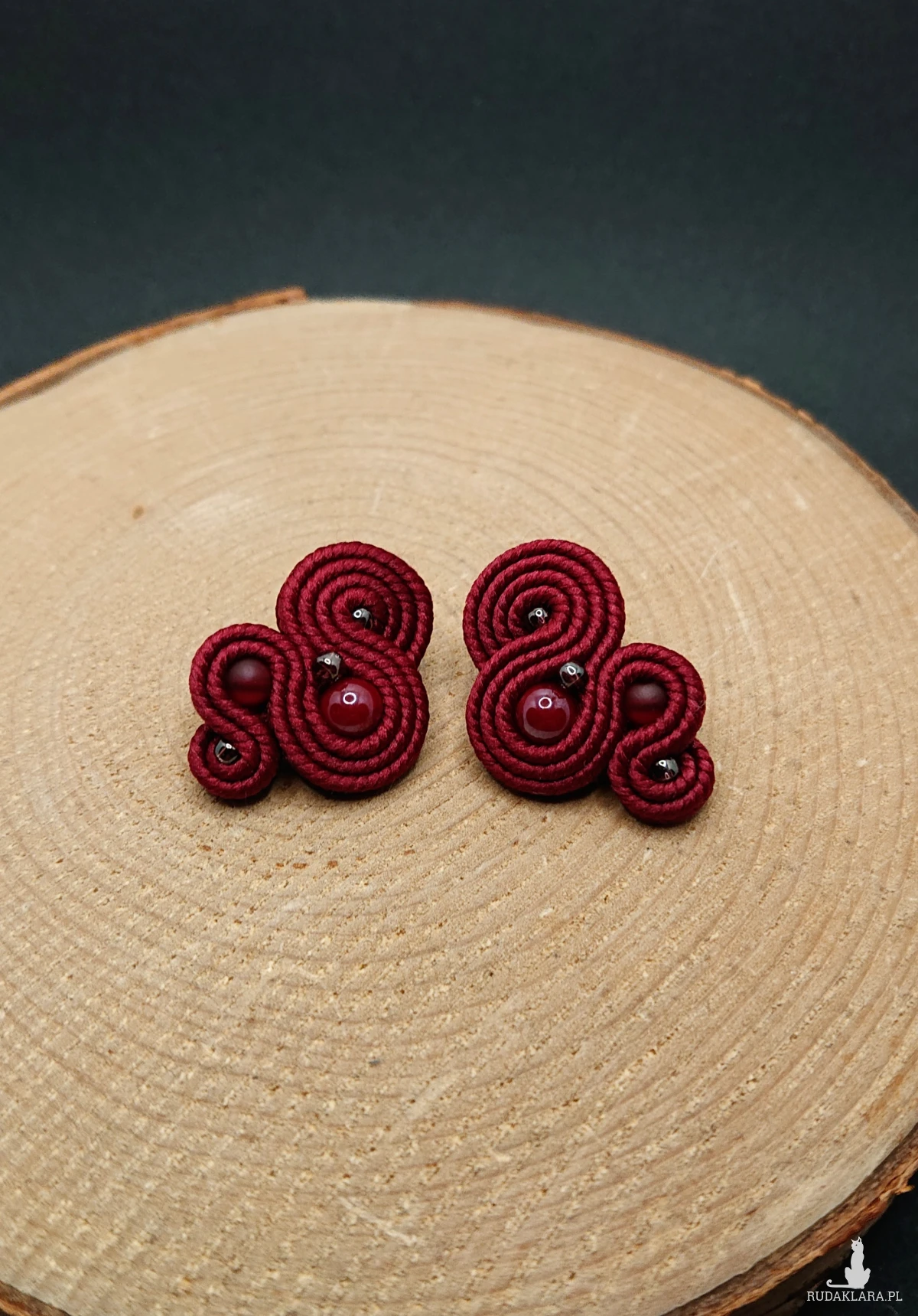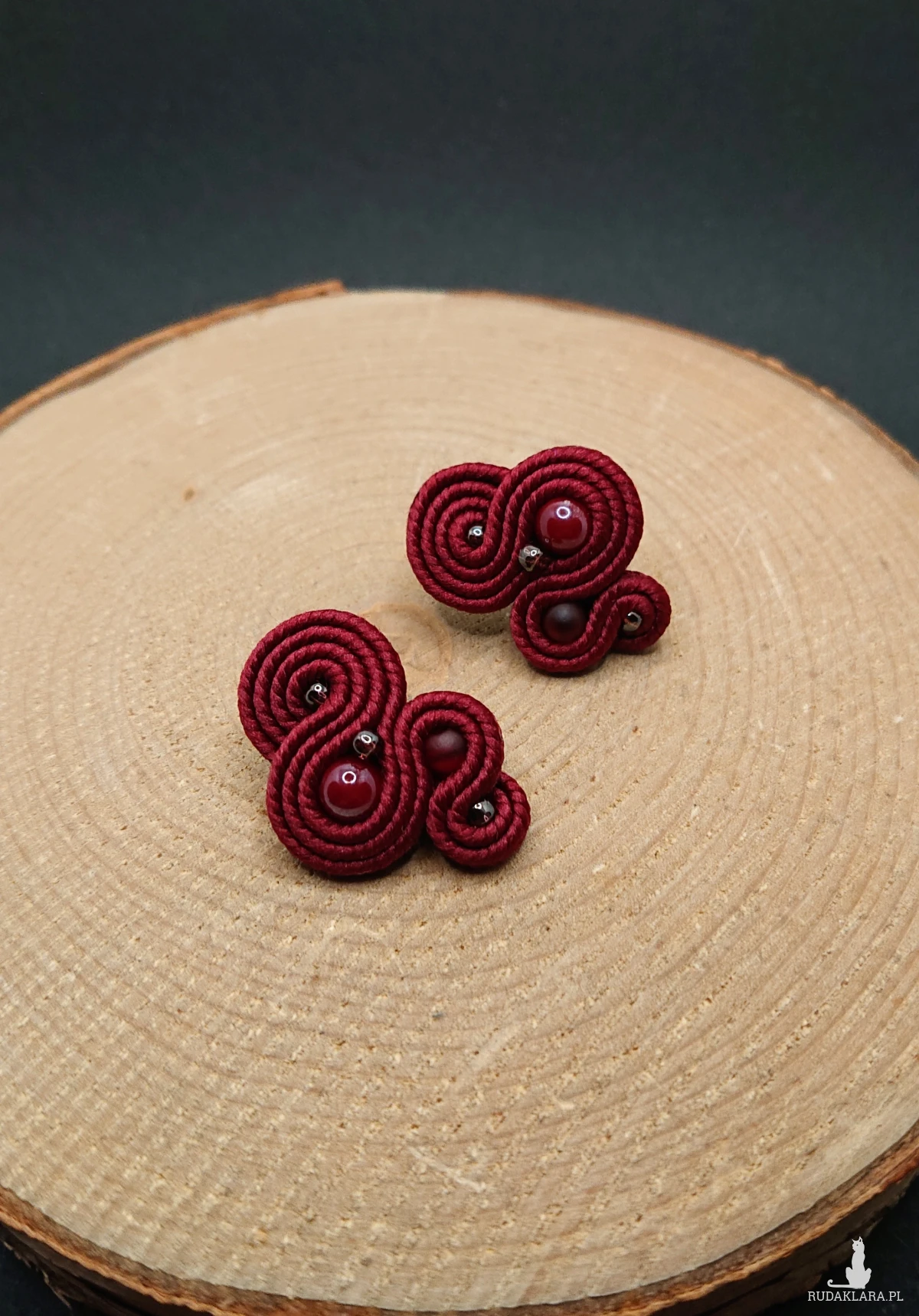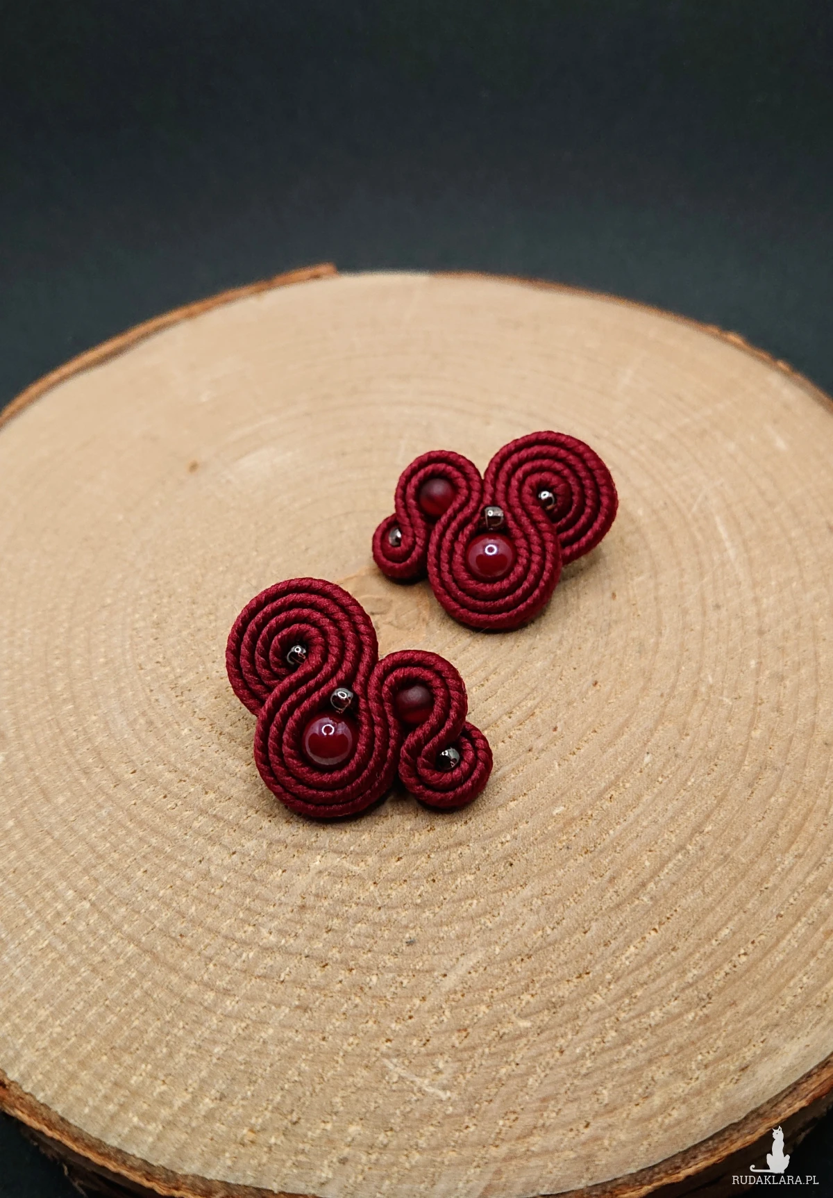 Niewielkie kolczyki sutasz wykonane z szklanych koralików oraz polskich sznurków sutasz. Kolory w kolczykach: bordo. Kolczyki zamocowane na sztyftach ze stali chirurgicznej.
