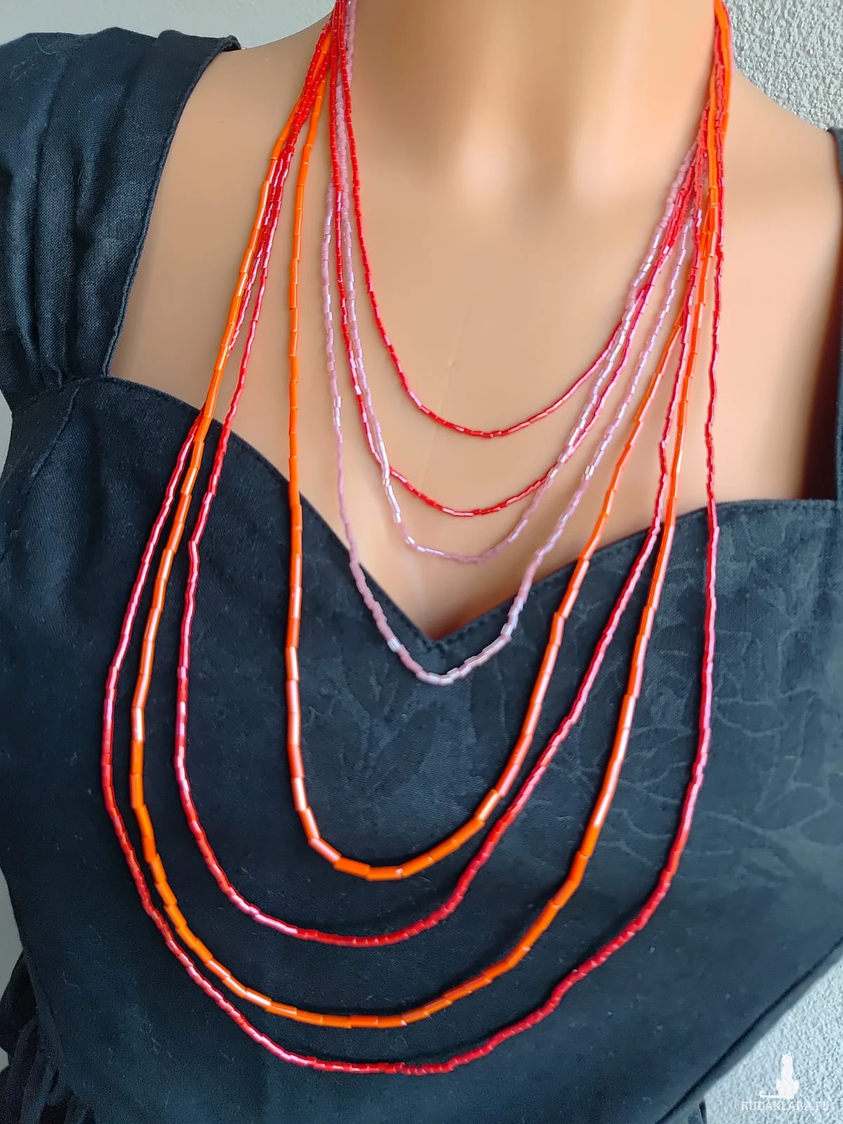 Naszyjnik kaskadowy z cienkich rurek szklanych w żywych kolorach czerwonym, różu i pomarańczy. Bardzo delikatny, lekki. Wykończenie metalowe i zapięcie ze stali nierdzewnej. Objętość 46 cm