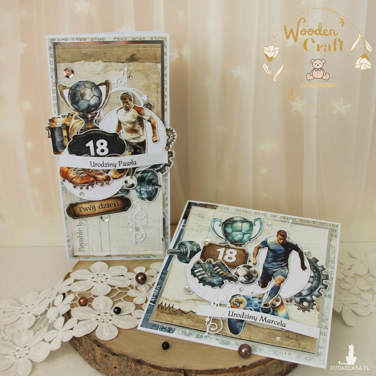 Nietuzinkowa, męska kartka urodzinowa, idealna na 18 urodziny fana piłki nożnej. Utrzymana w odcieniach beżu z dodatkiem błyszczących srebrnych akcentów, zamknięta w białym pudełeczku z okienkiem. Wykonana ręcznie z mixu męskich kolekcji papierów, ozdobiona licznymi grafikami o tematyce piłkarskiej, srebrnymi cekinami, a także napisem "Twój Dzień", imieniem solenizanta oraz cyferką 18.