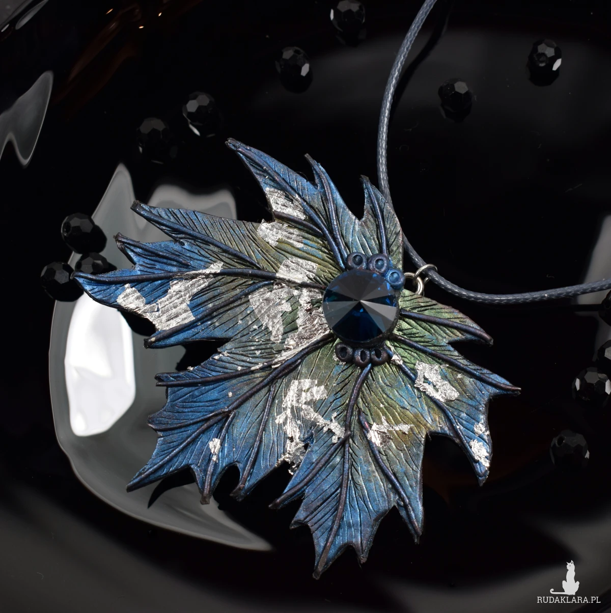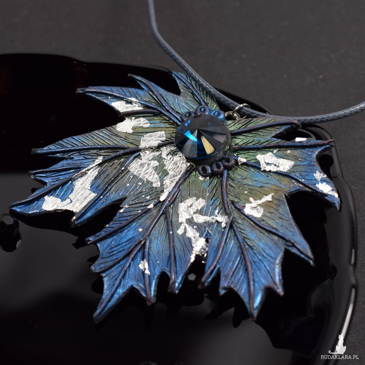 Wisior w formie liścia klonu, utrzymany w odcieniach srebrzystego błękitu i zieleni.