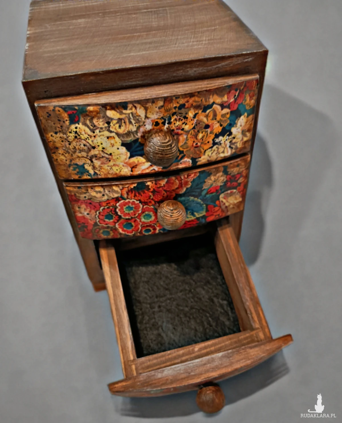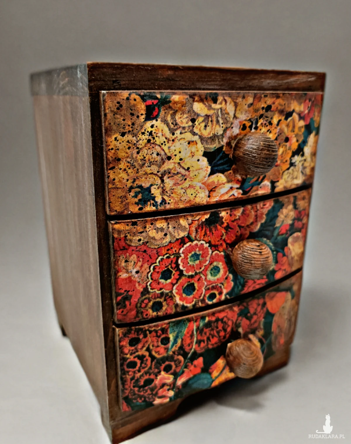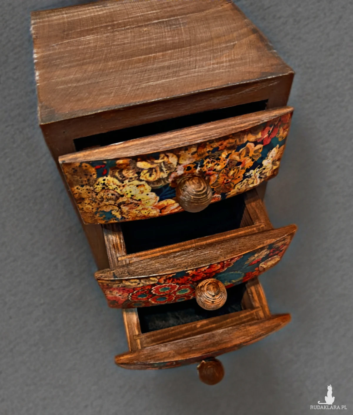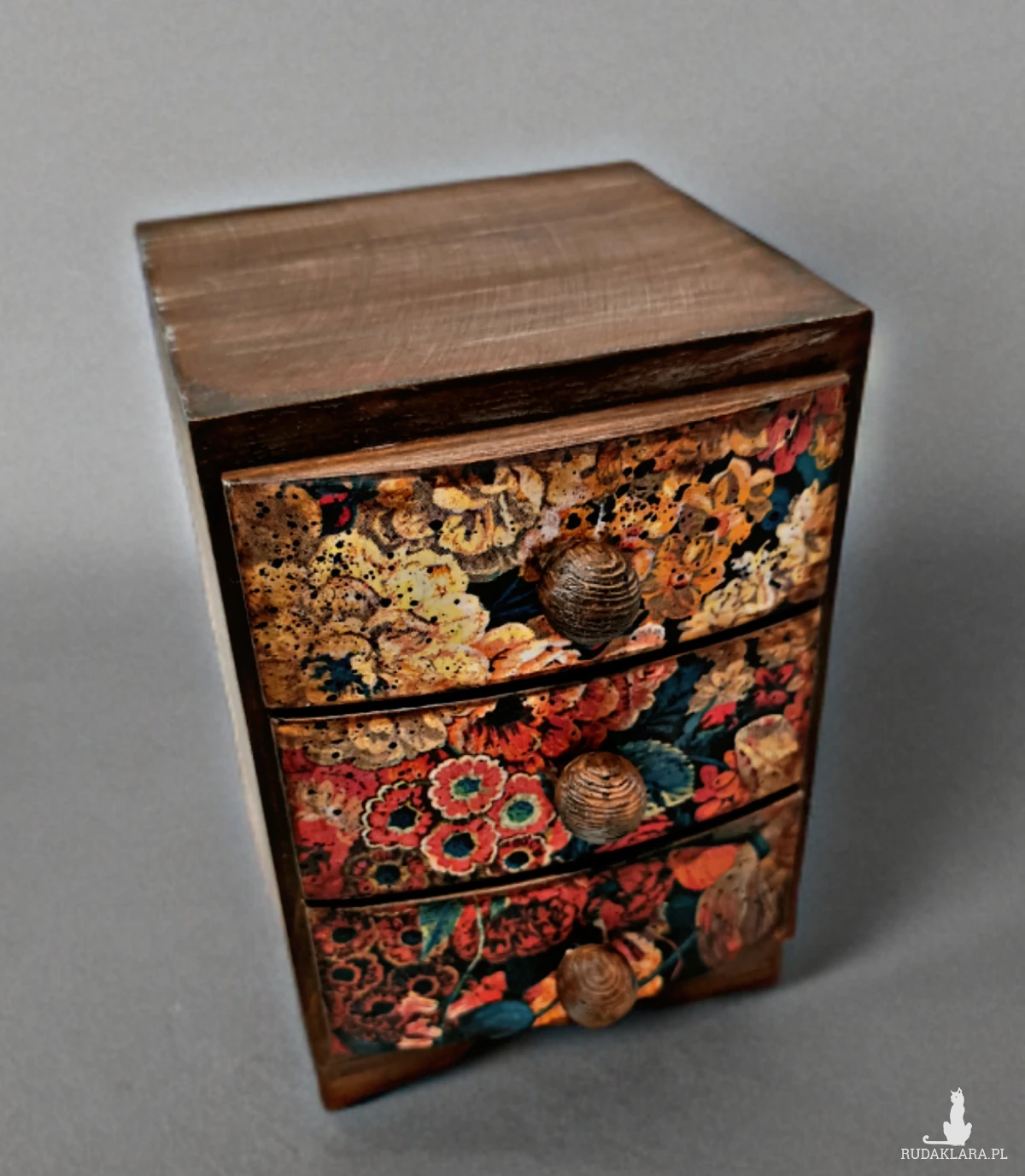 Drewniana szkatułka na biżuterię w kształcie małej komódki, z trzema szufladkami.