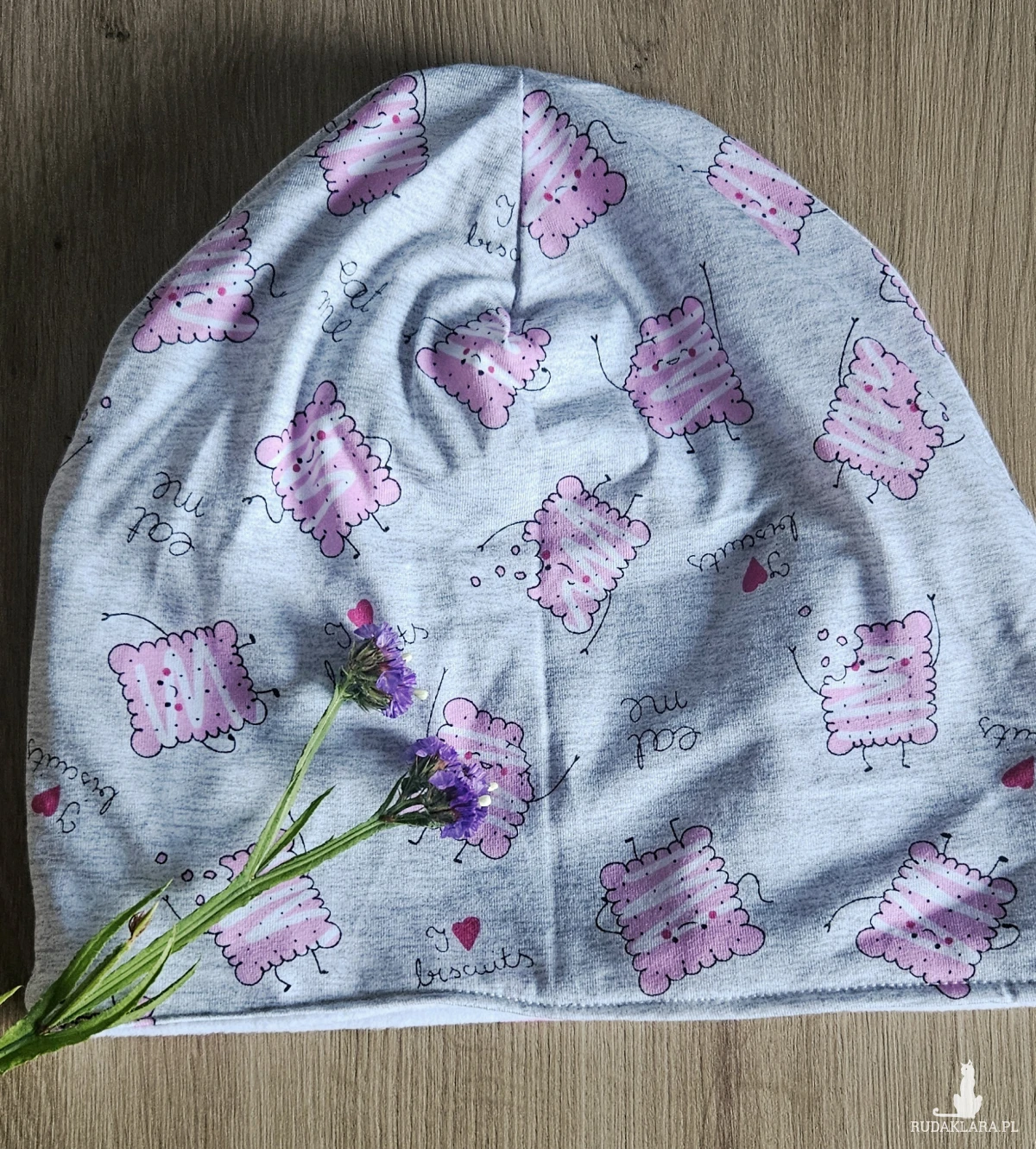 Czapka model: szara czapka z różowymi wesołymi herbatnikami